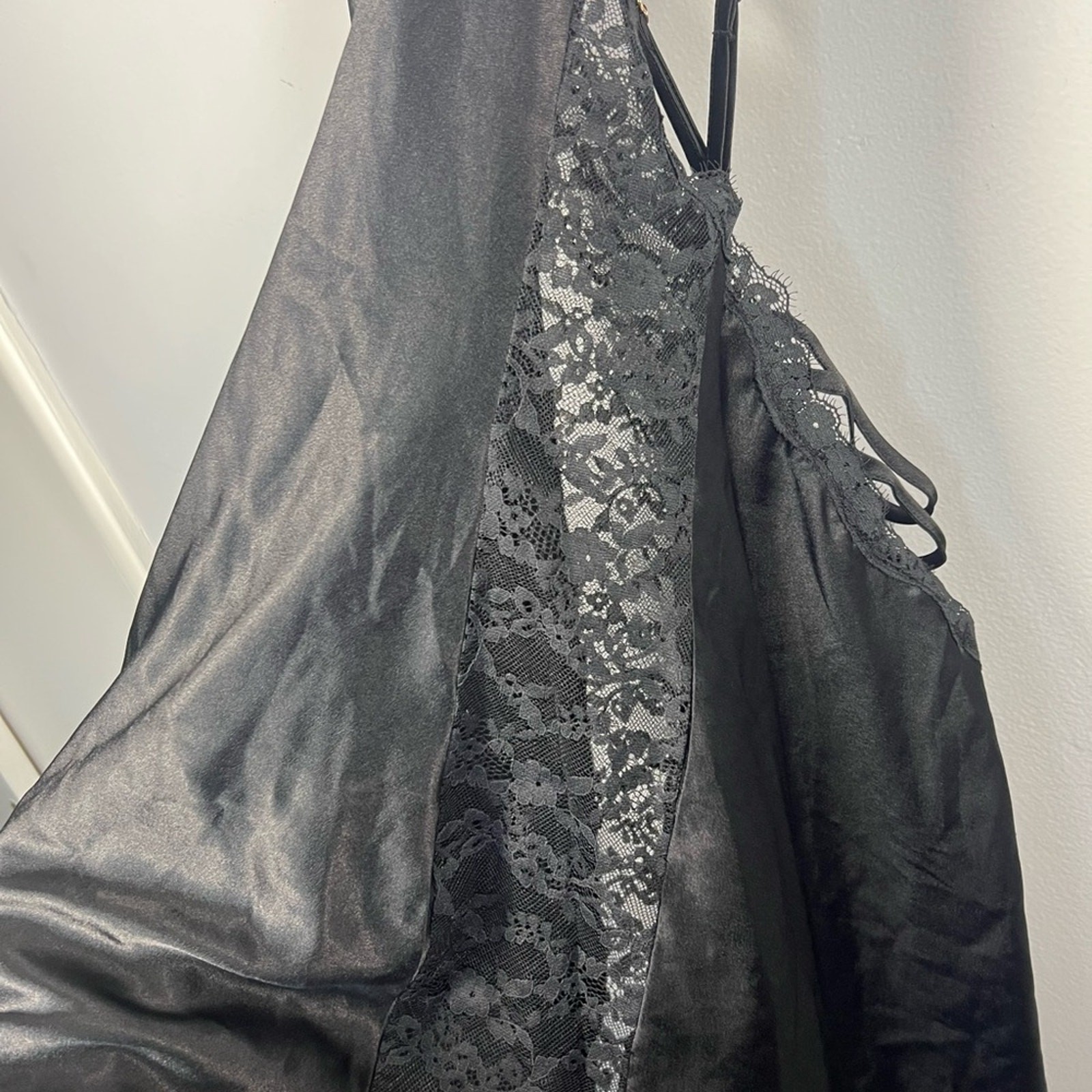 как выглядит Victorias Secret Black Lace Low Open Back Slip Dress Pajama Lingerie Large фото