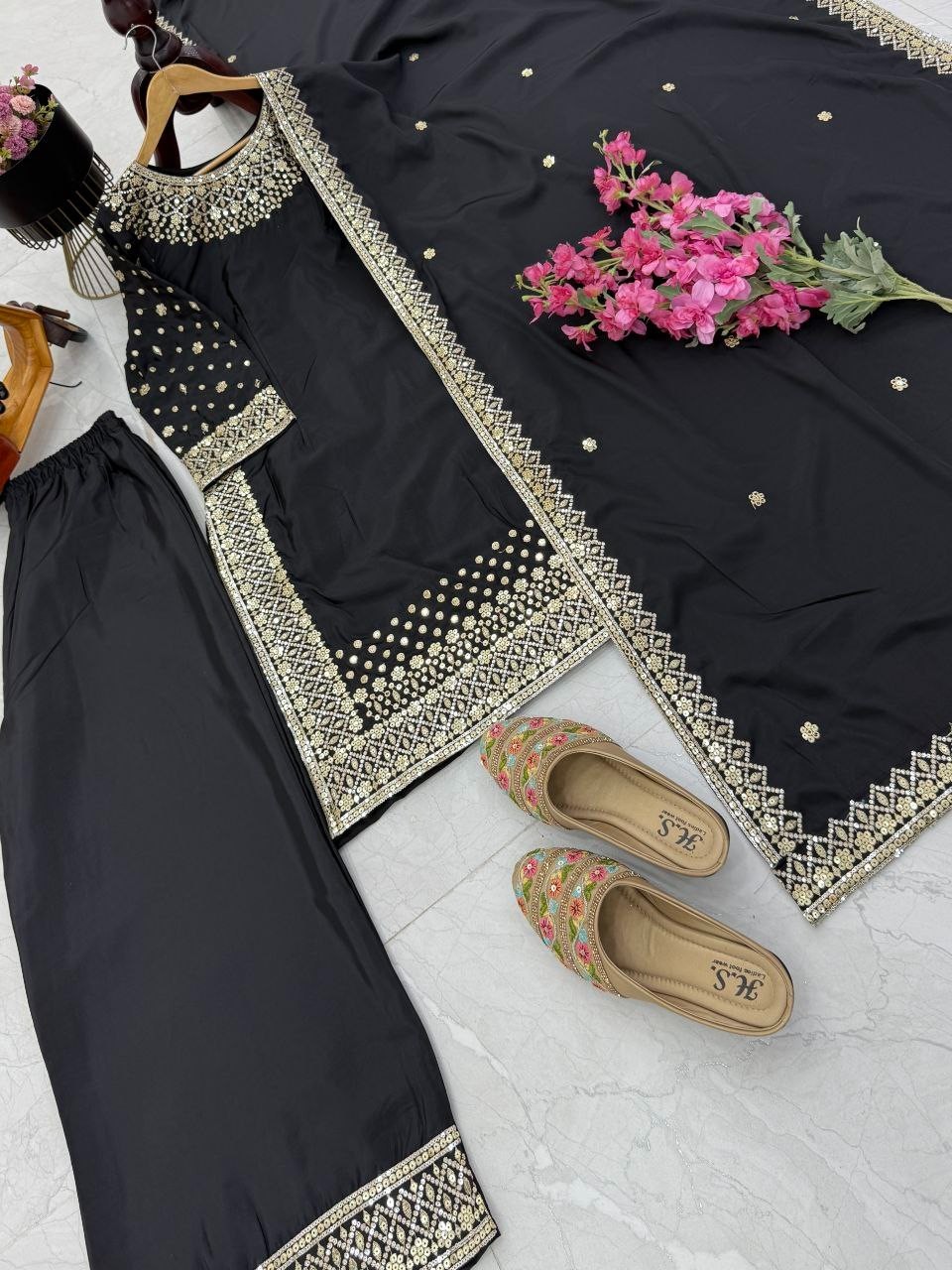как выглядит Latest New Natural Crepe Top Palazzo With Black Dupatta For Aesthetic Wear фото
