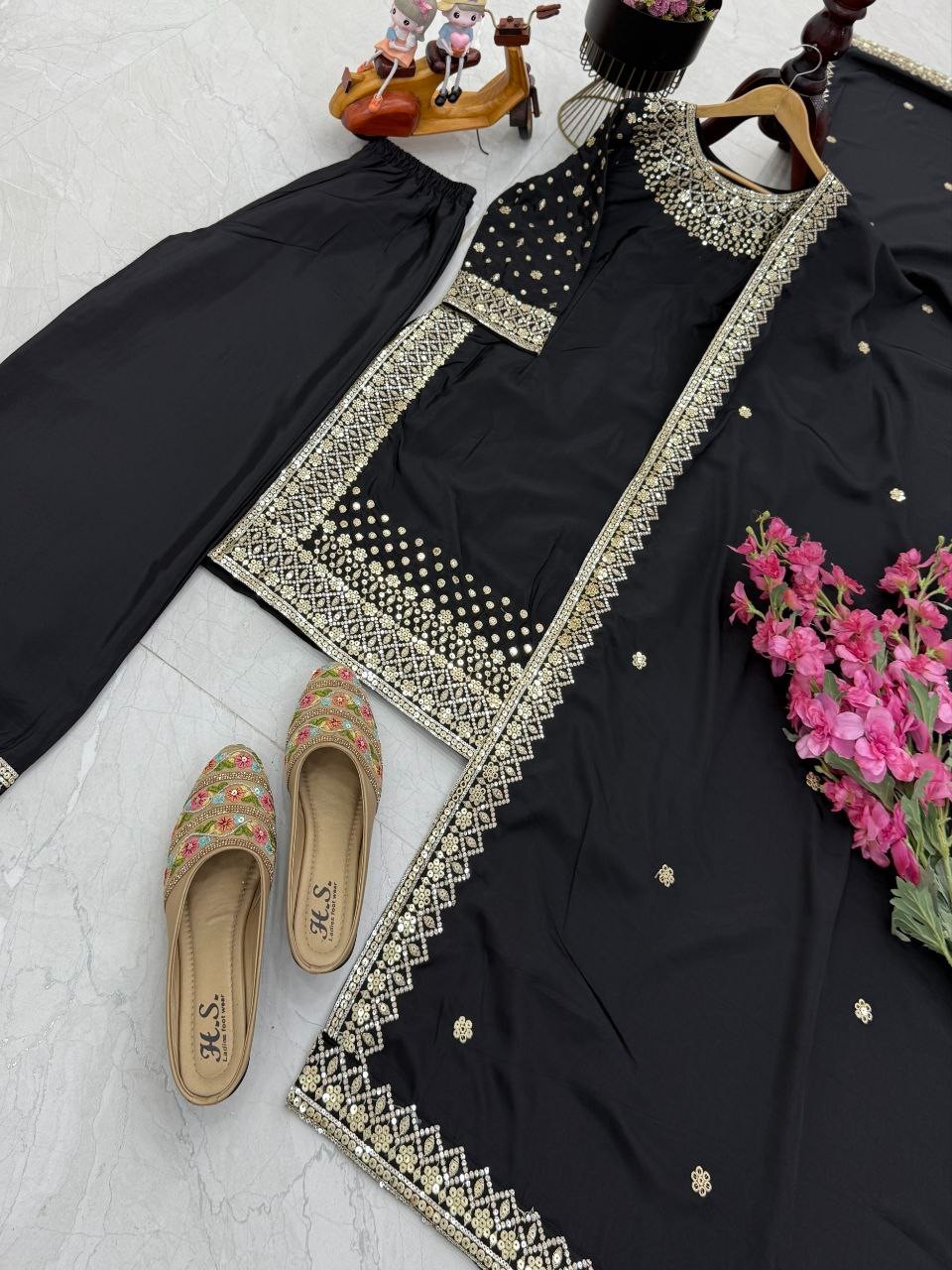 Latest New Natural Crepe Top Palazzo With Black Dupatta For Aesthetic Wear