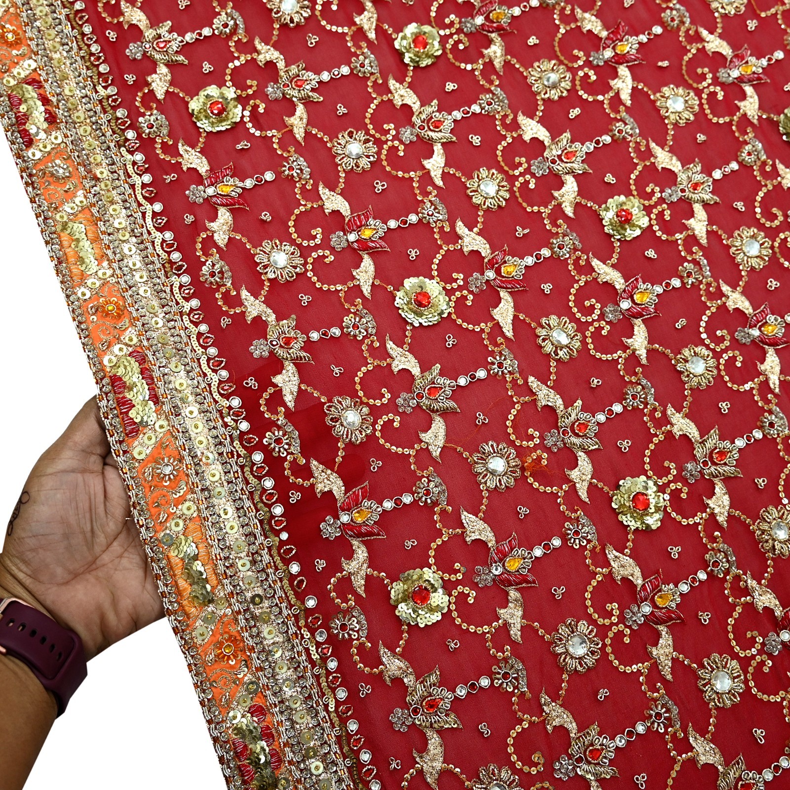 Vintage Heavy Bridal Dupatta Red Pure Georgette Silk Stole Hand Embroidered Veil