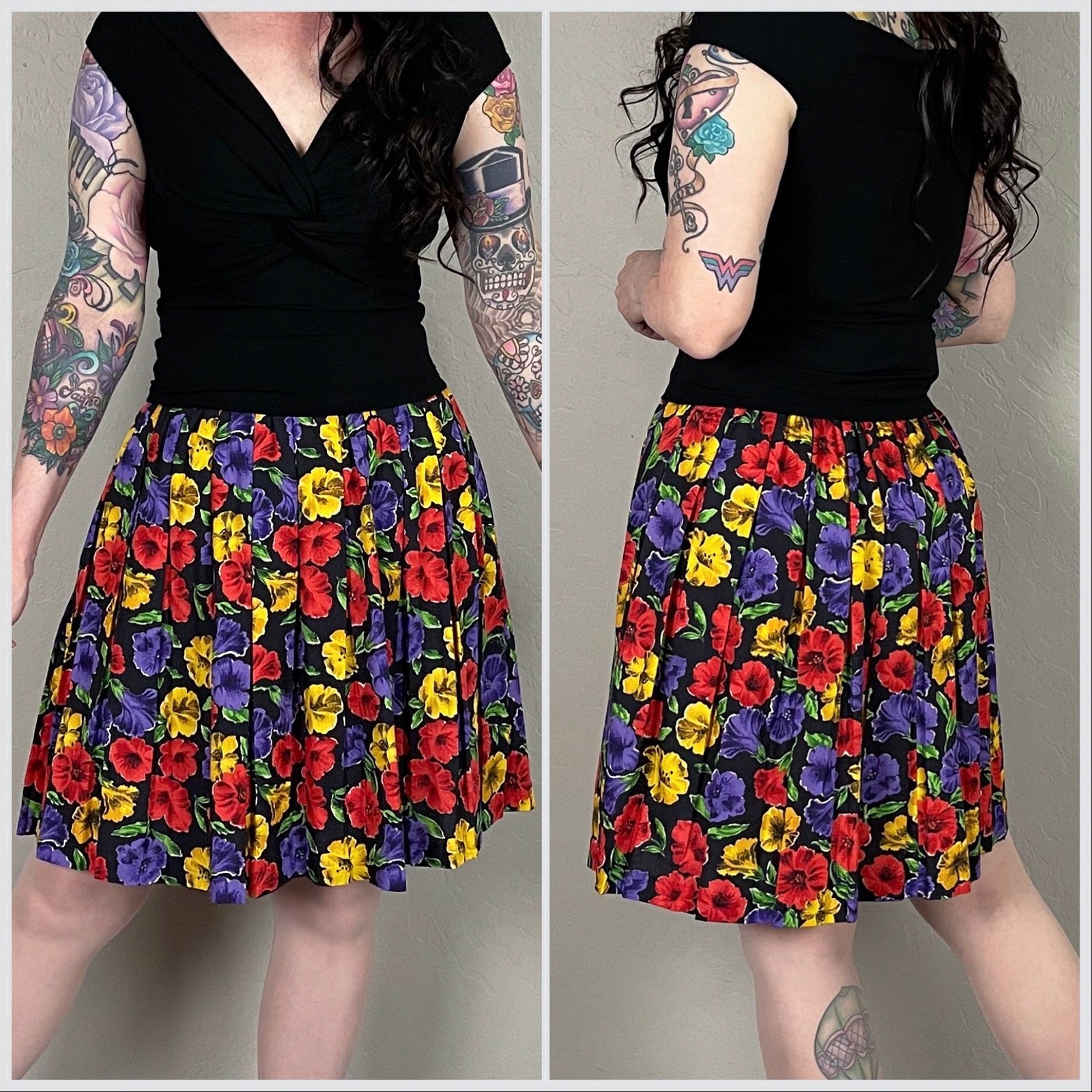 Vintage 1980s Black Petunia Print Pleated Mini Skirt 26-28 Waist