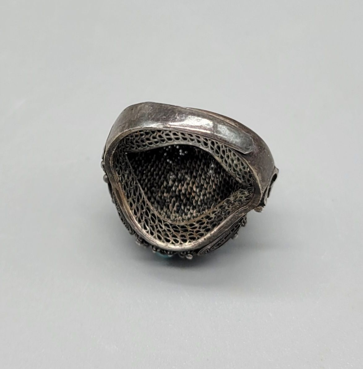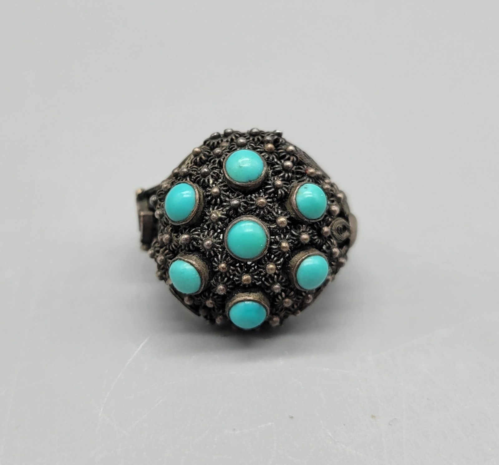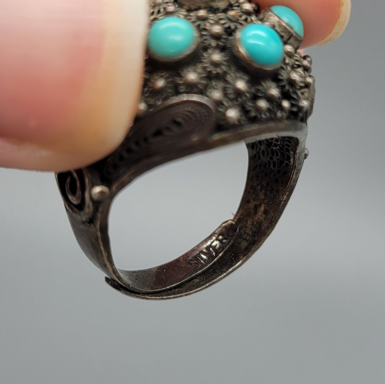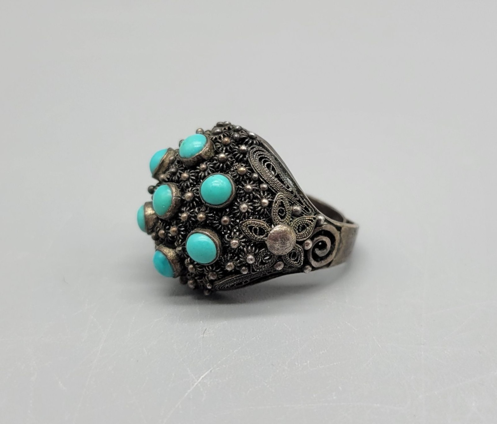 как выглядит Vintage Sterling Silver Filagree Turquoise Dome Adjustable Signed Ring R1 фото