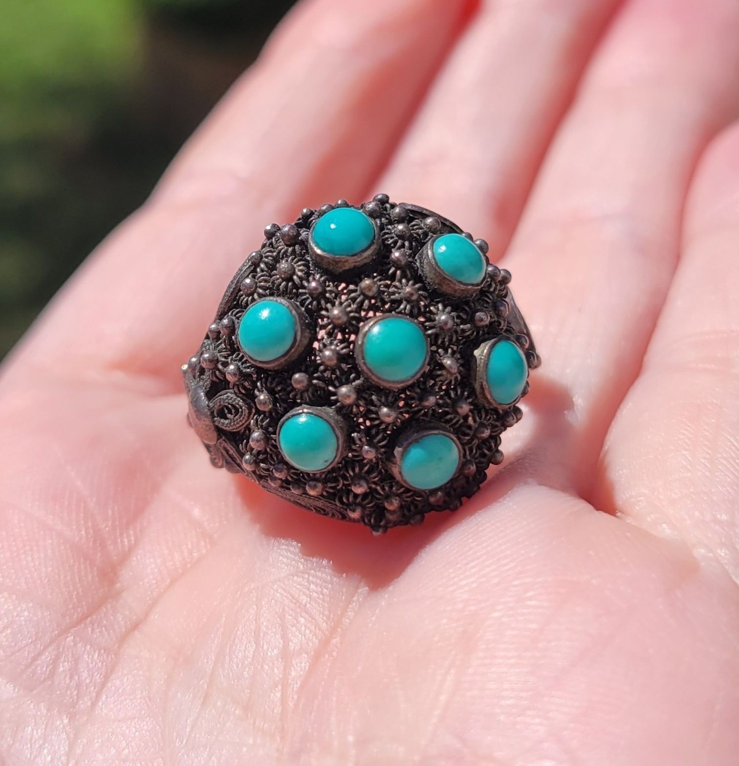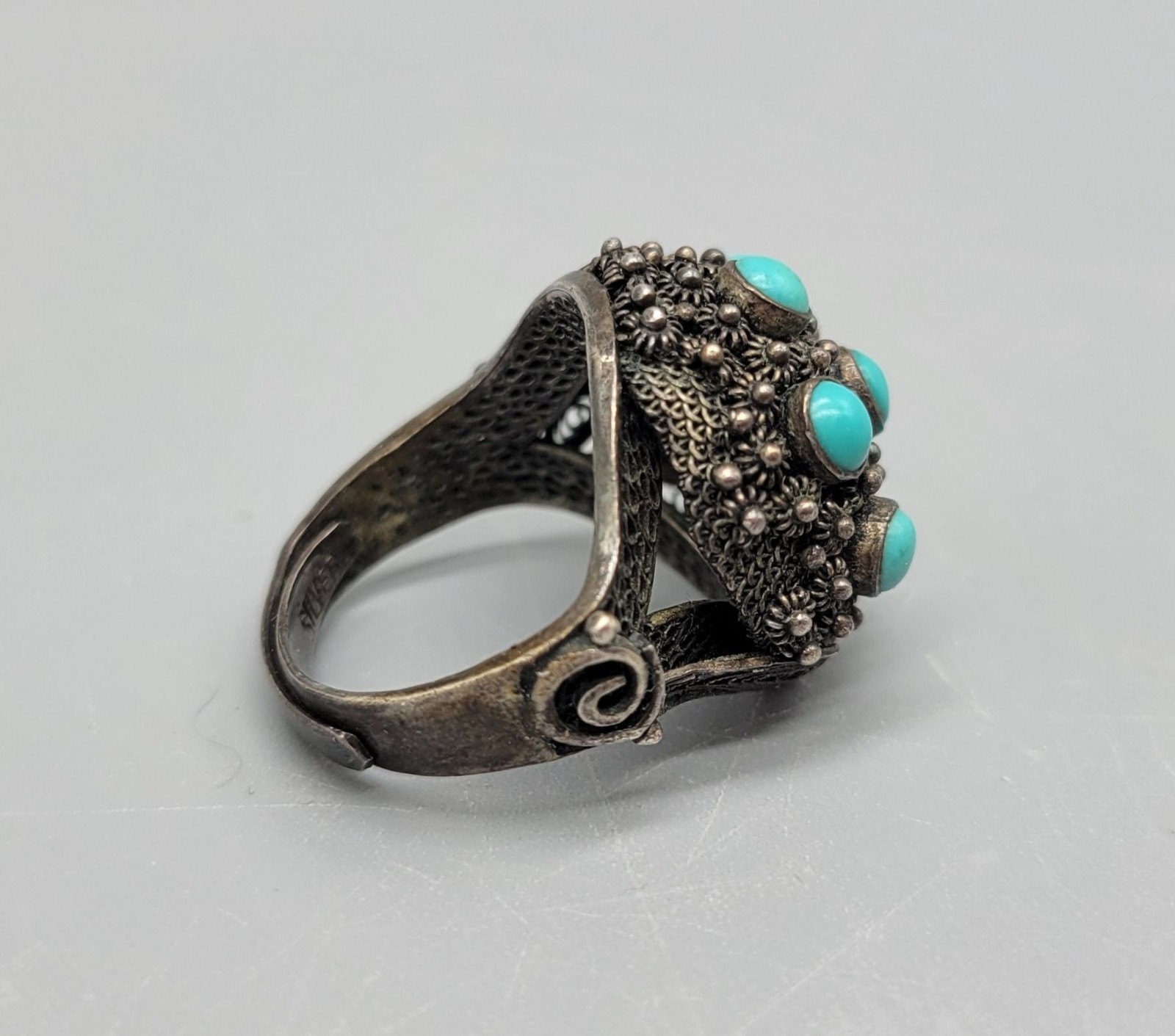 Vintage Sterling Silver Filagree Turquoise Dome Adjustable Signed Ring R1
