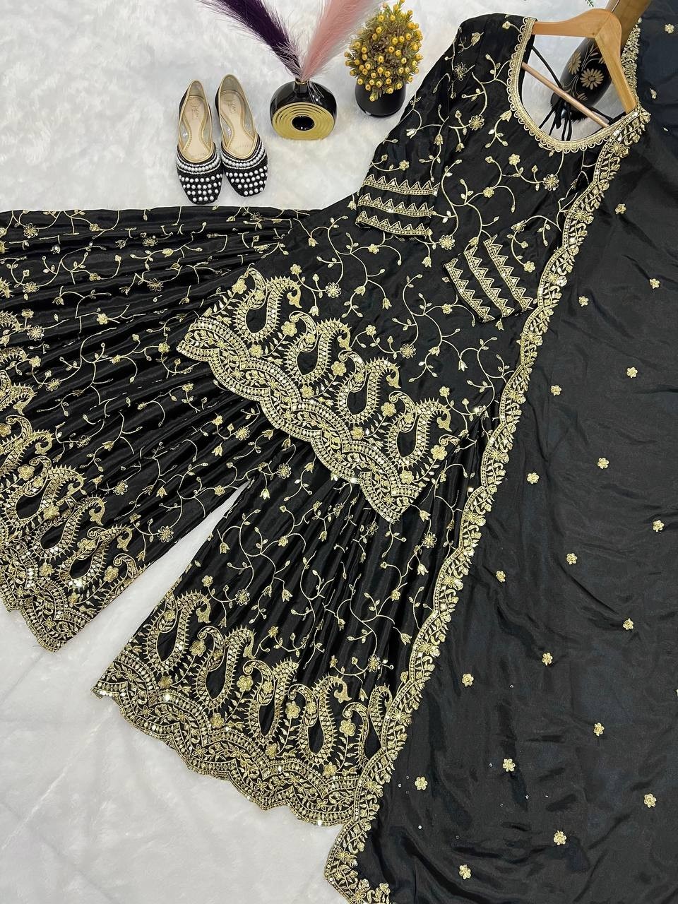 как выглядит Readymade Heavy Chinnon Silk Top Palazzo With Black Dupatta For Festival Wear фото