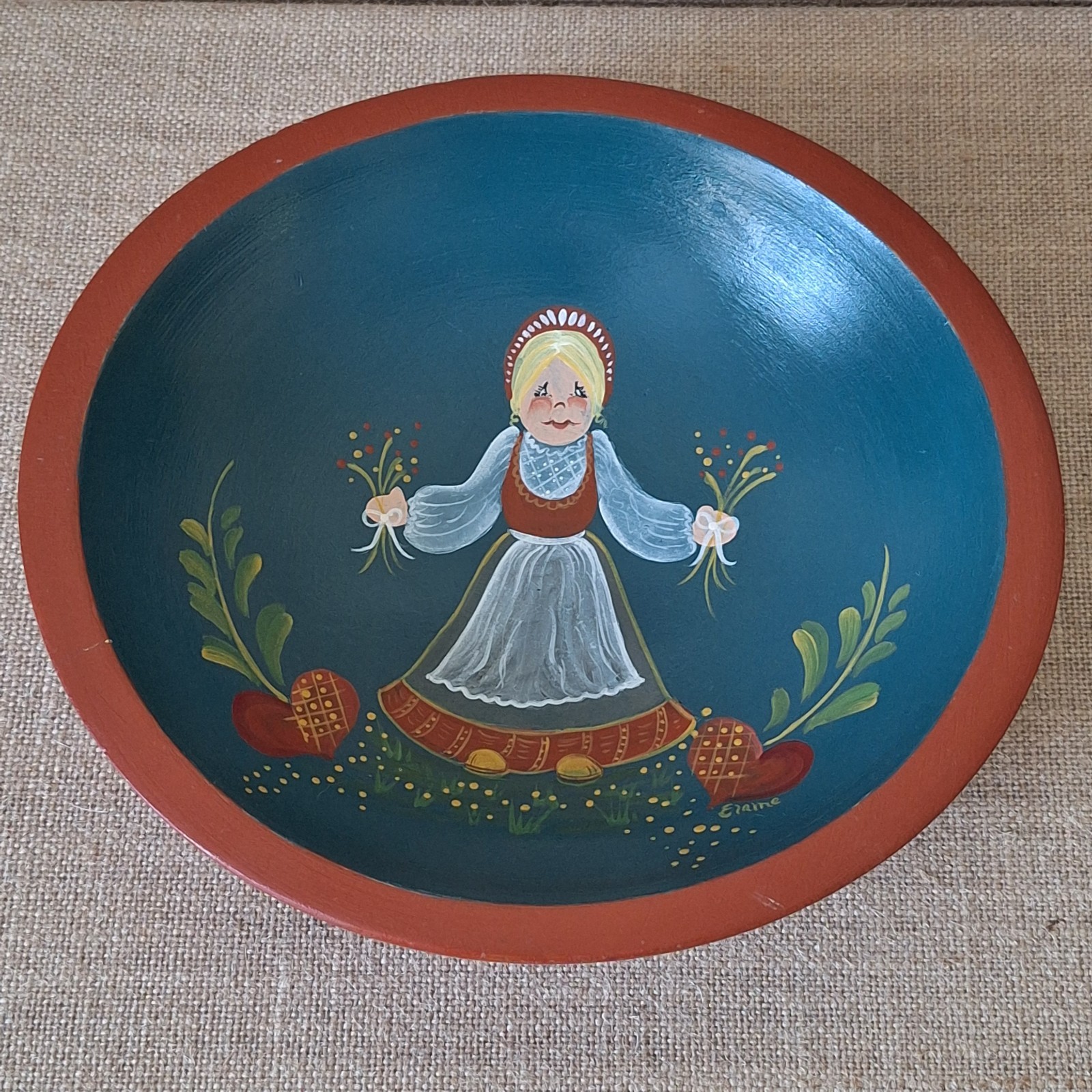 Vintage Handpainted Rosemaling Folk Art Wood Bowl Dutch Girl Primitive Rustic