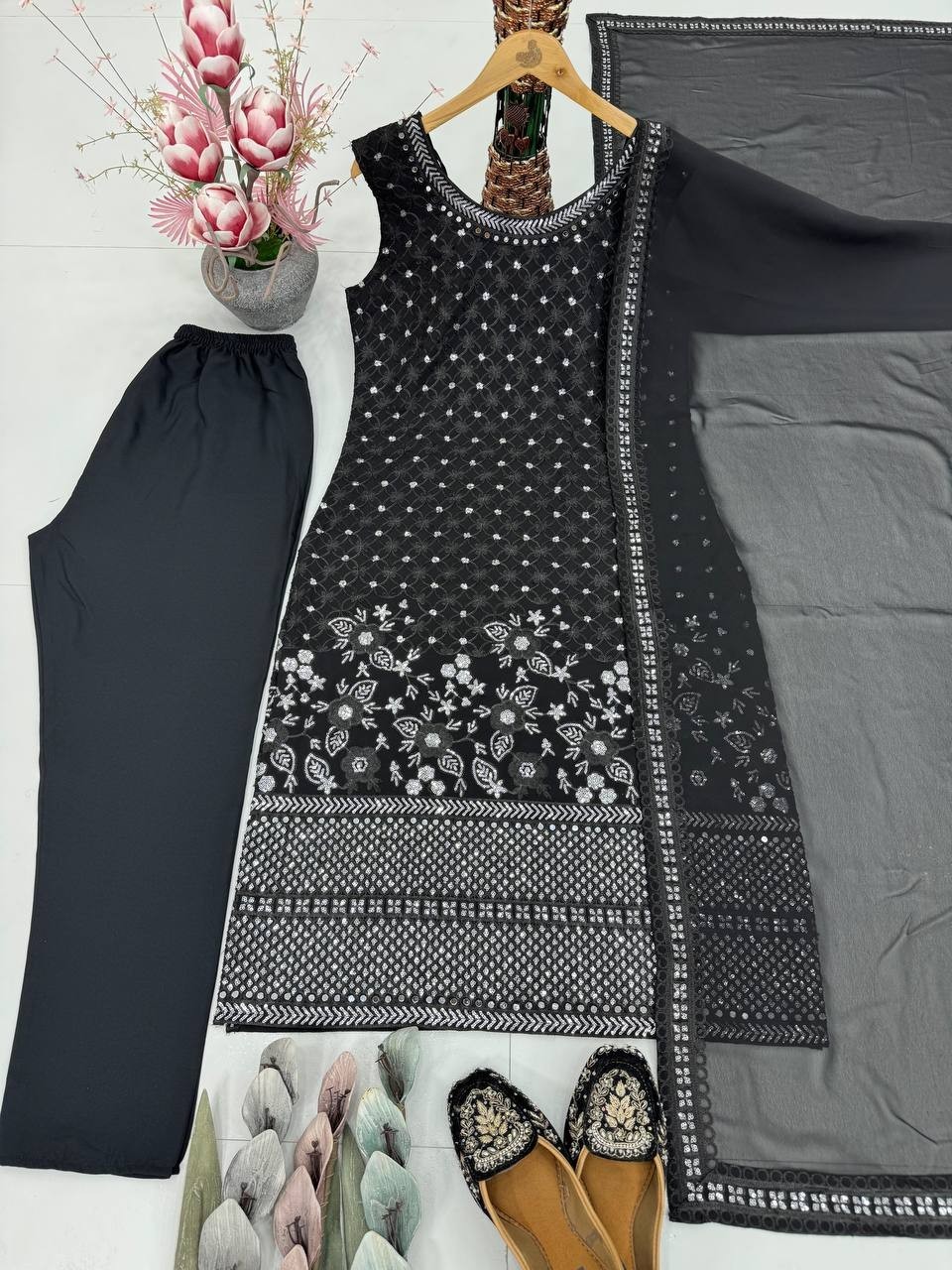как выглядит New Fancy Heavy Faux Georgette Salwar Kameez With Black Dupatta For Reception фото