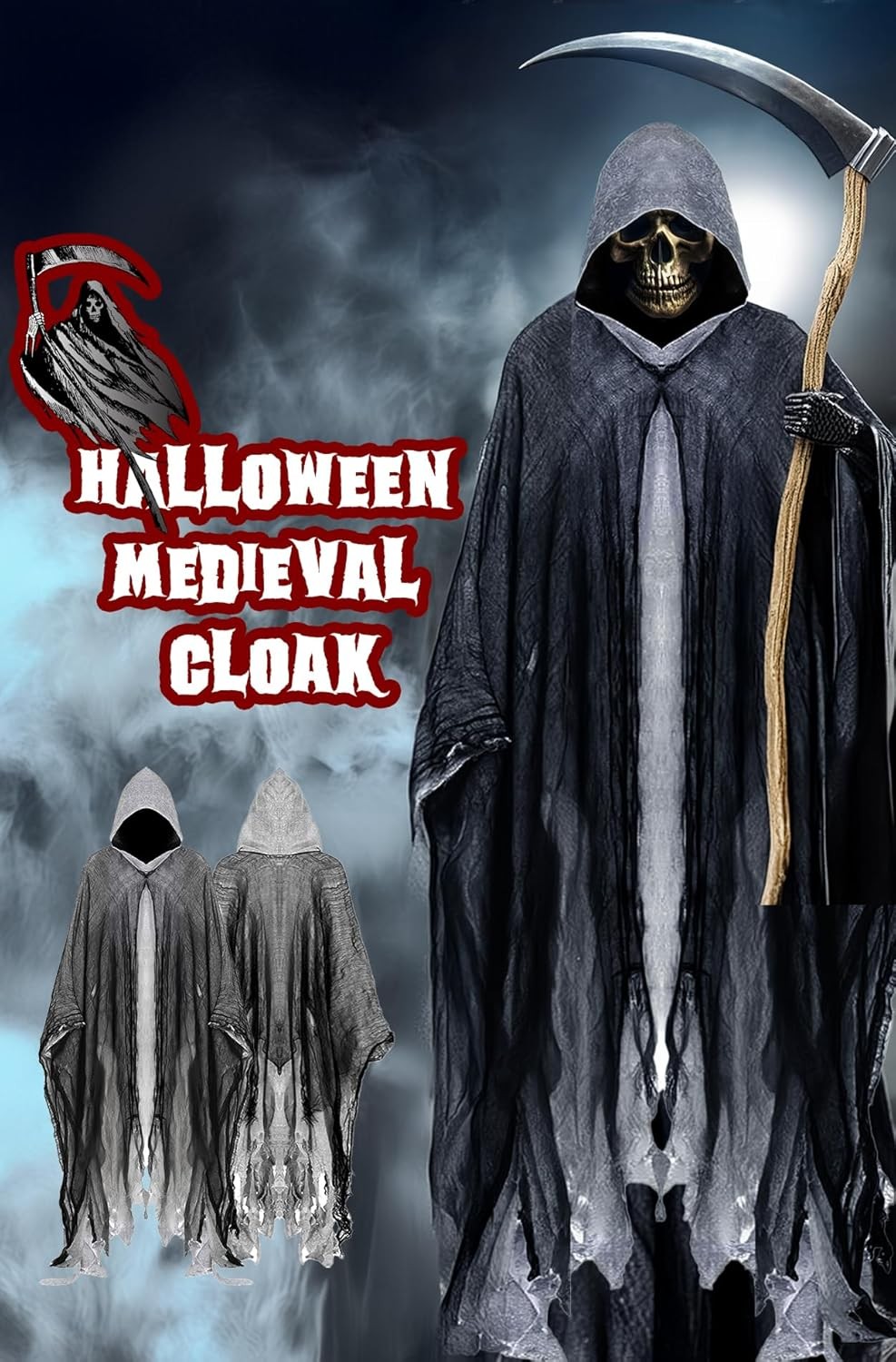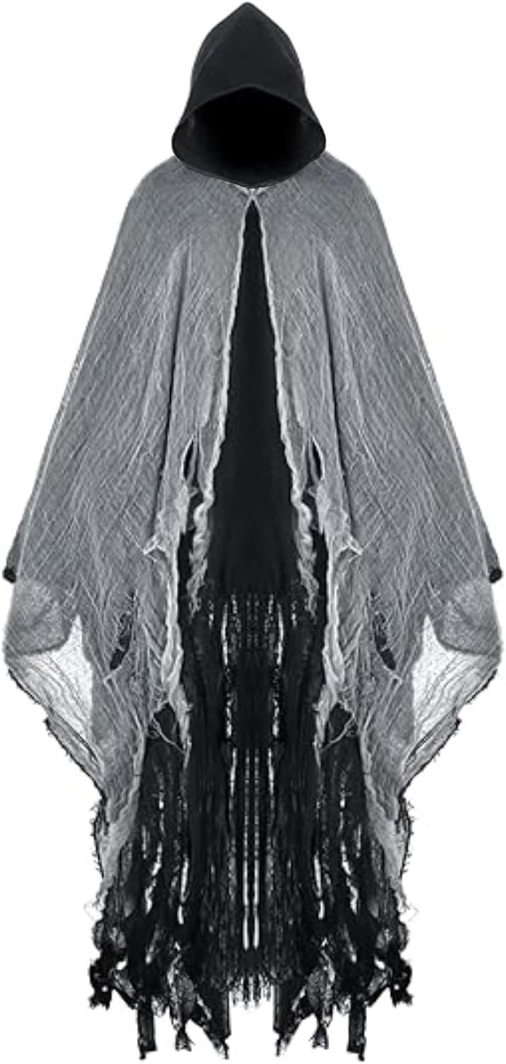 Halloween Hooded Grim Reaper Costume Cloak Witch Vampire Wizard Cape - Black