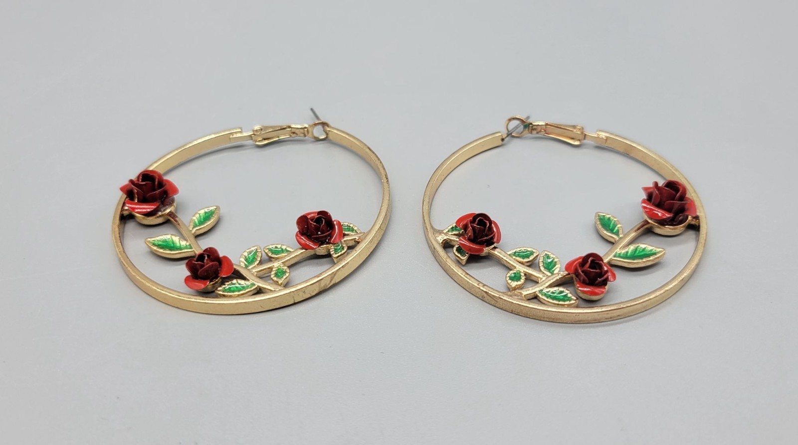 как выглядит Gold Tone Red Rose Dangle Hoop Costume Earrings E1 фото
