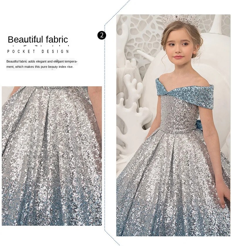 Kids Prom Dresses Girls Sequins Ball Gowns Evening Party Dress Blue and white