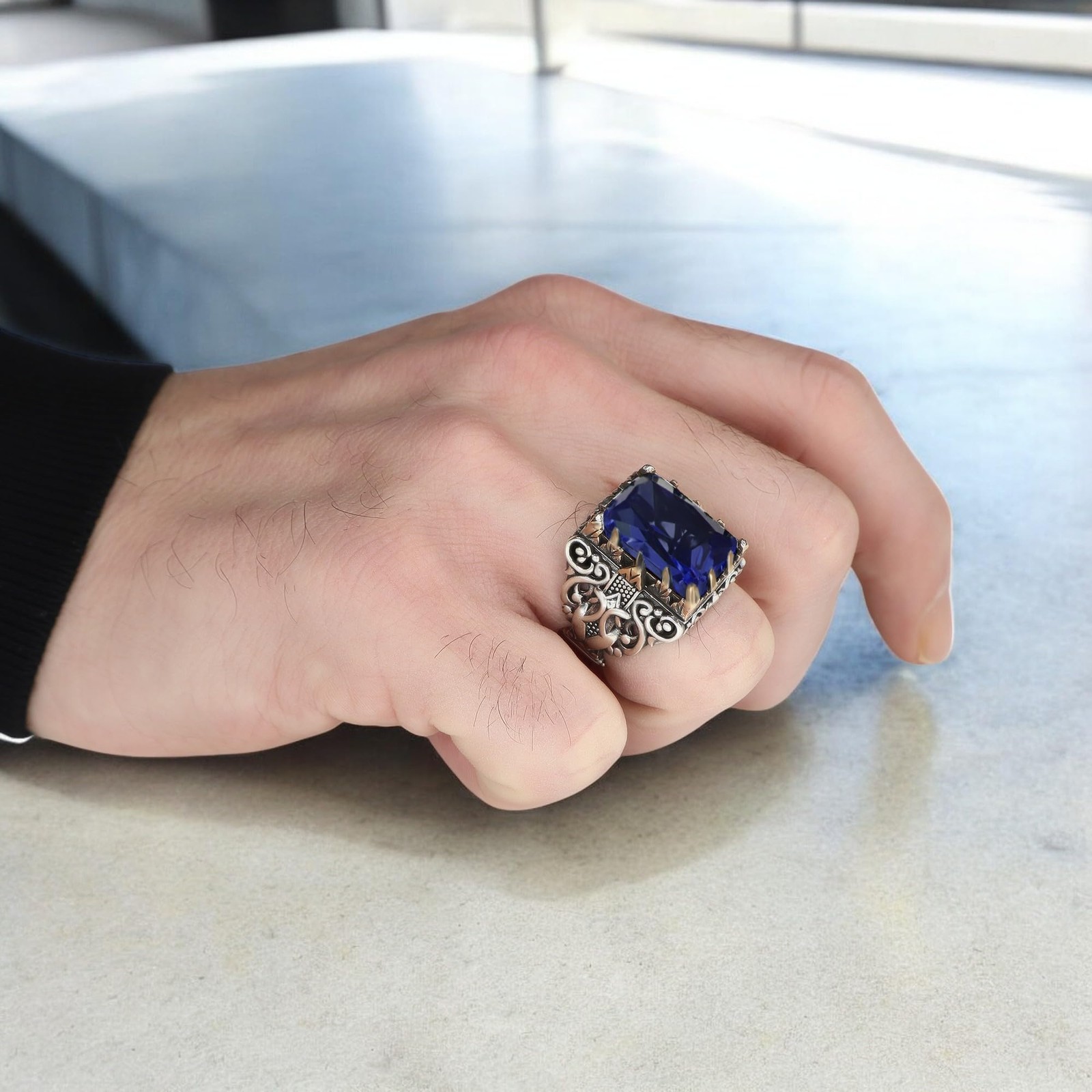 как выглядит Handcrafted 925 Sterling Silver Ring with Sapphire Stone, Intricate Floral фото
