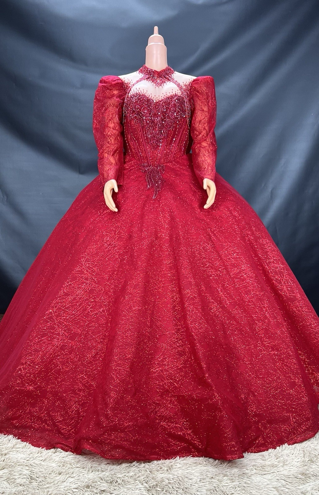 как выглядит HIGH QUALITY RED HIGH NECK FLOOR LENGTH LONG SLEEVE LACE UP WEDDING DRESS фото