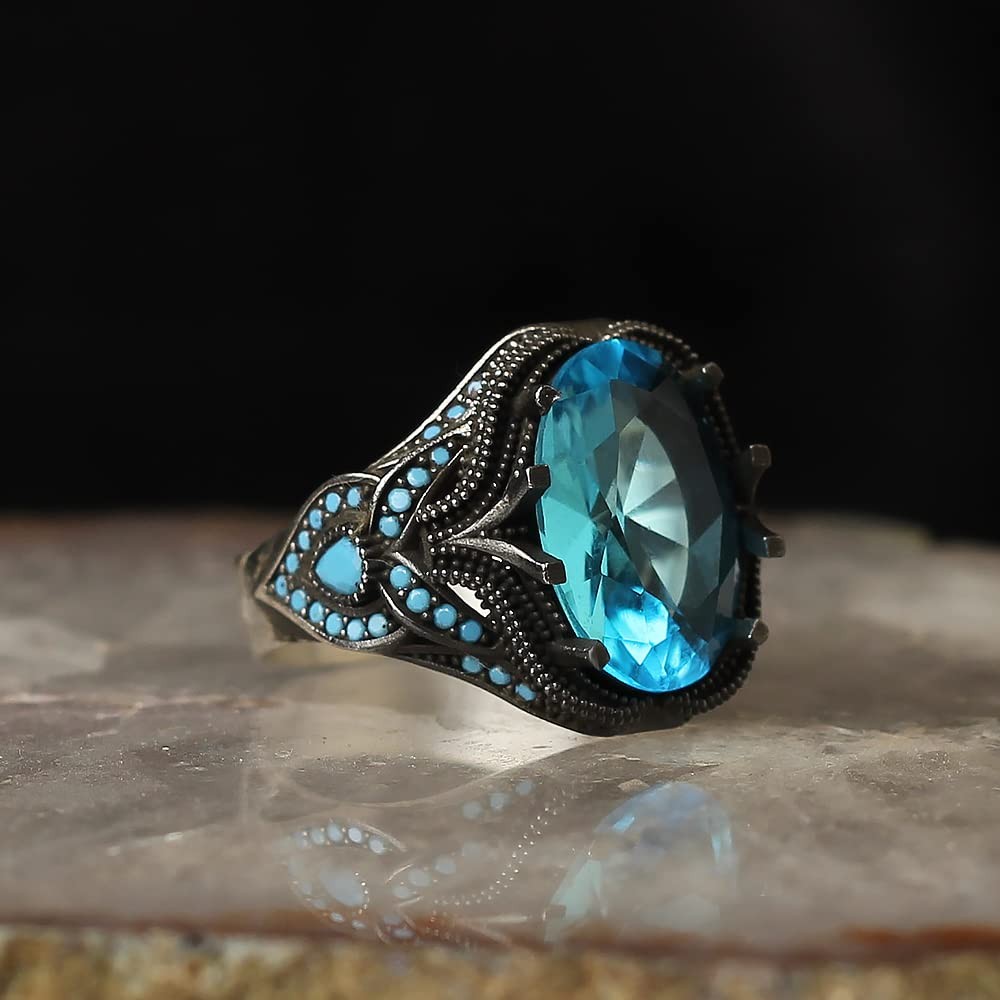 925 Sterling Silver Aquamarine Stone with Turquoise Stones Men Silver Ring,