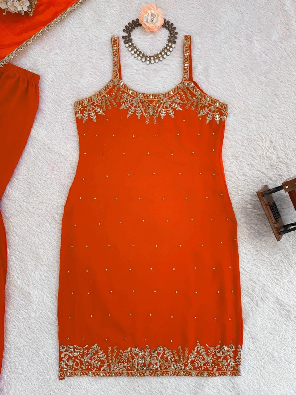 как выглядит Latest New Faux Georgette Top Palazzo With Orange Dupatta For Reception Wear фото