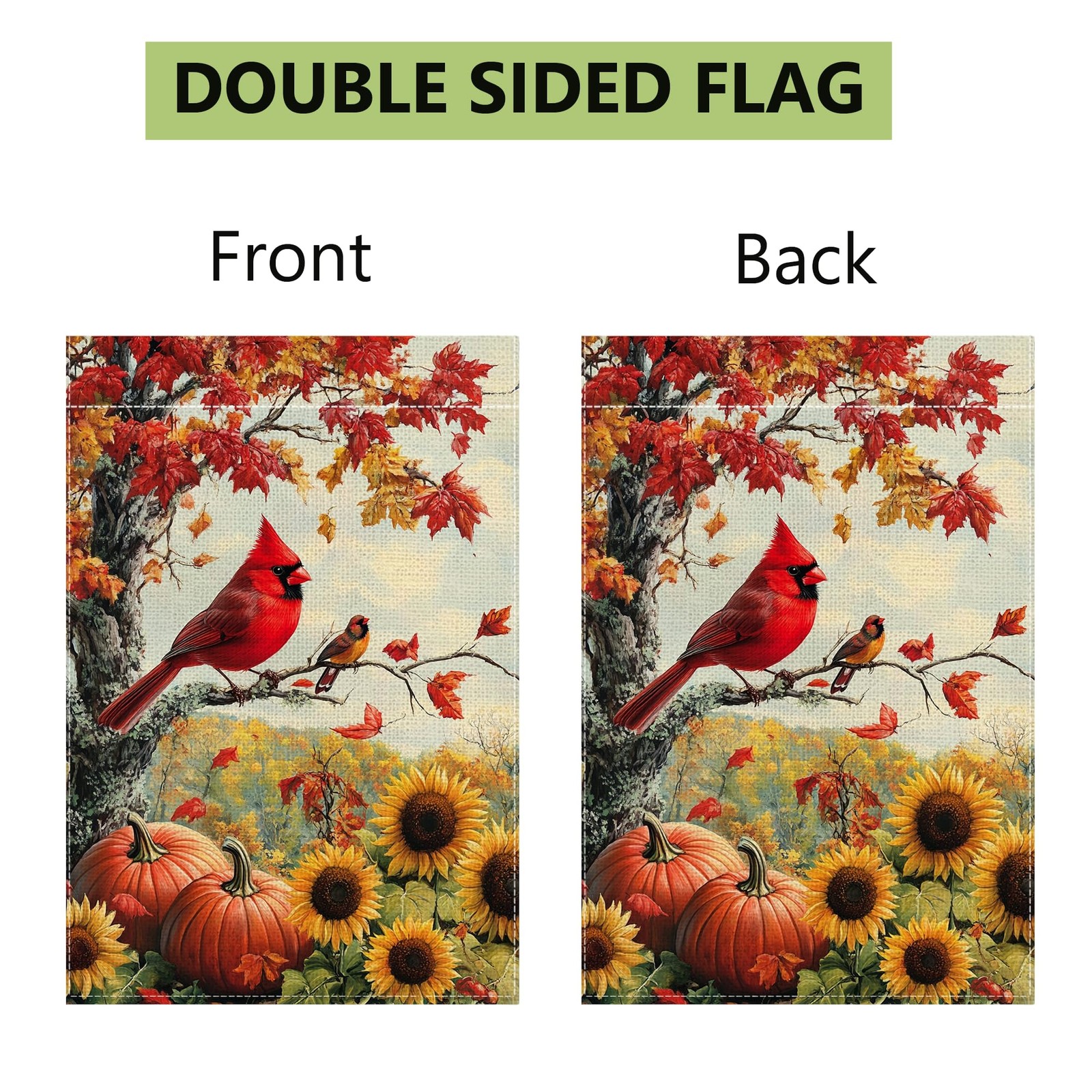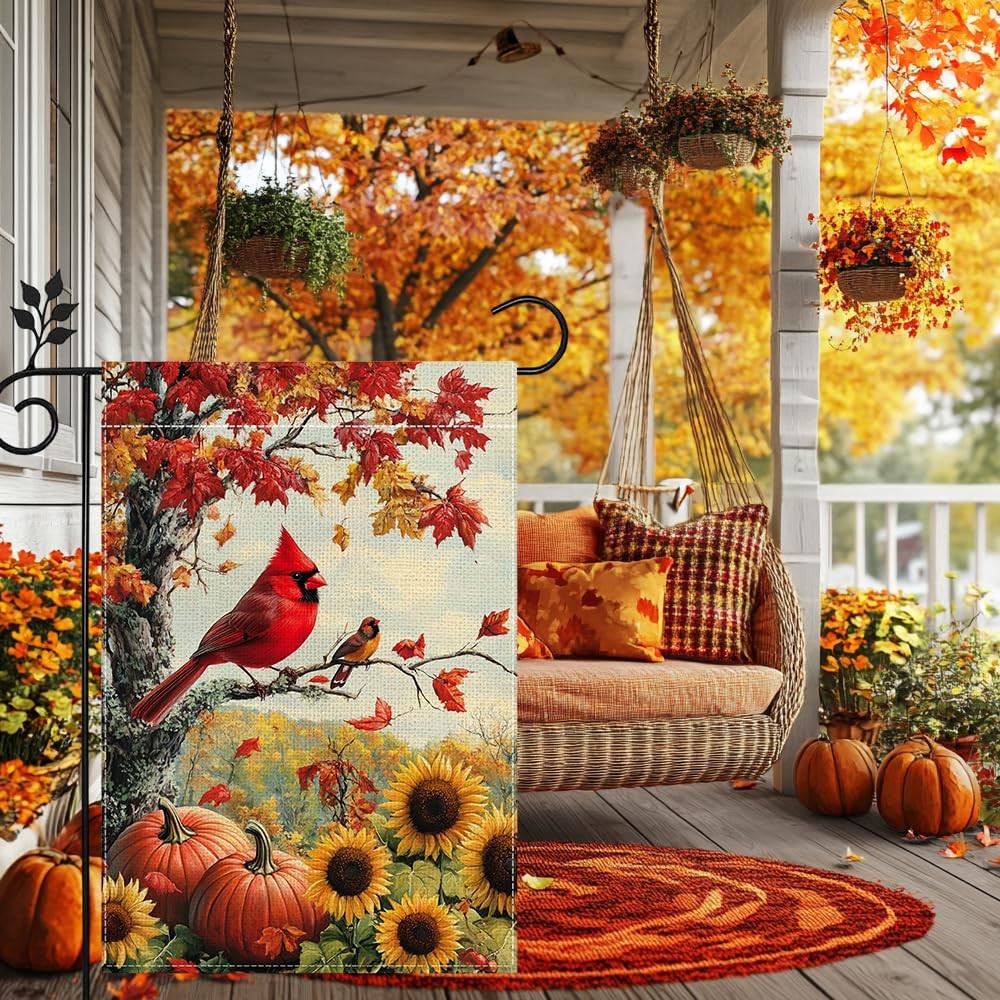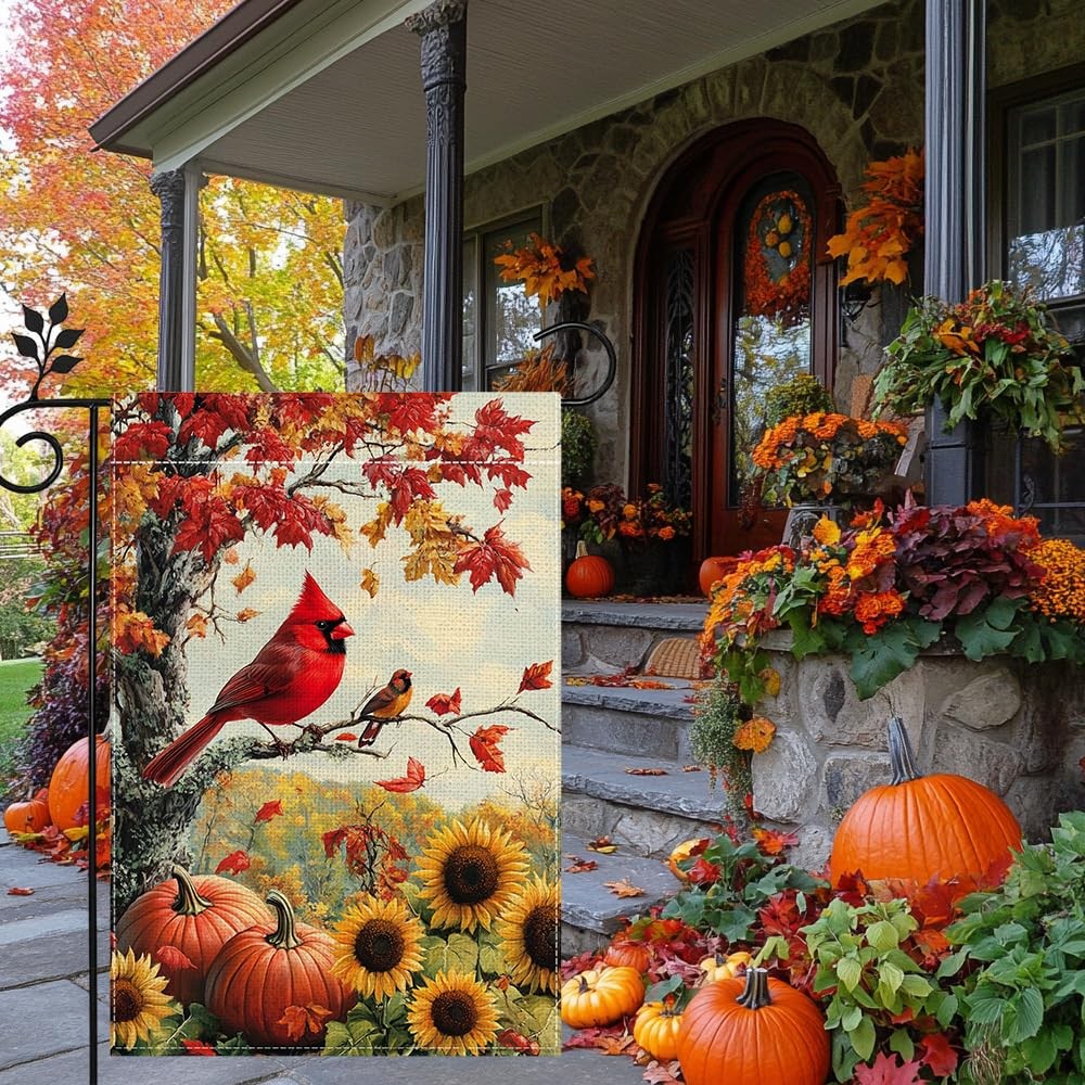 Fall Garden Flag 12x18in Double Sided Burlap Cardinal Pumpkin Autumn Maple Leaf