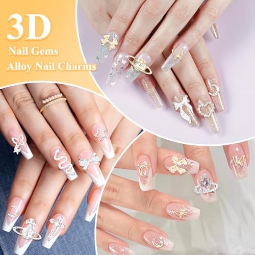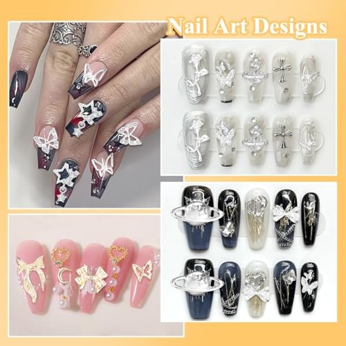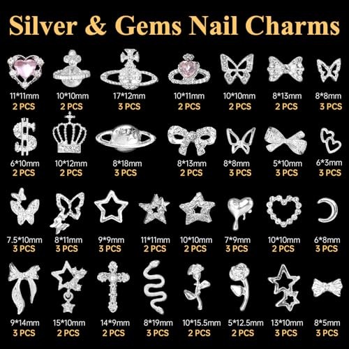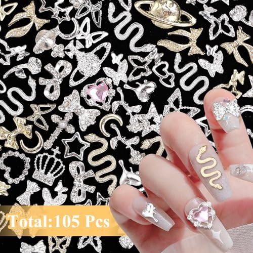 105 Pcs Silver Gold Nail Gems Charms, 3D Bows Star Nail Charms Silver Heart