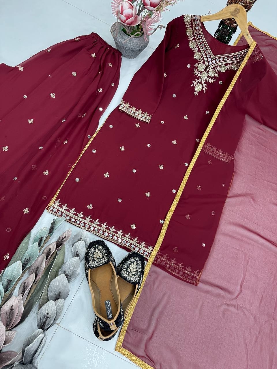Stunning Look Heavy Faux Georgette Top Palazzo With Maroon Dupatta For Women