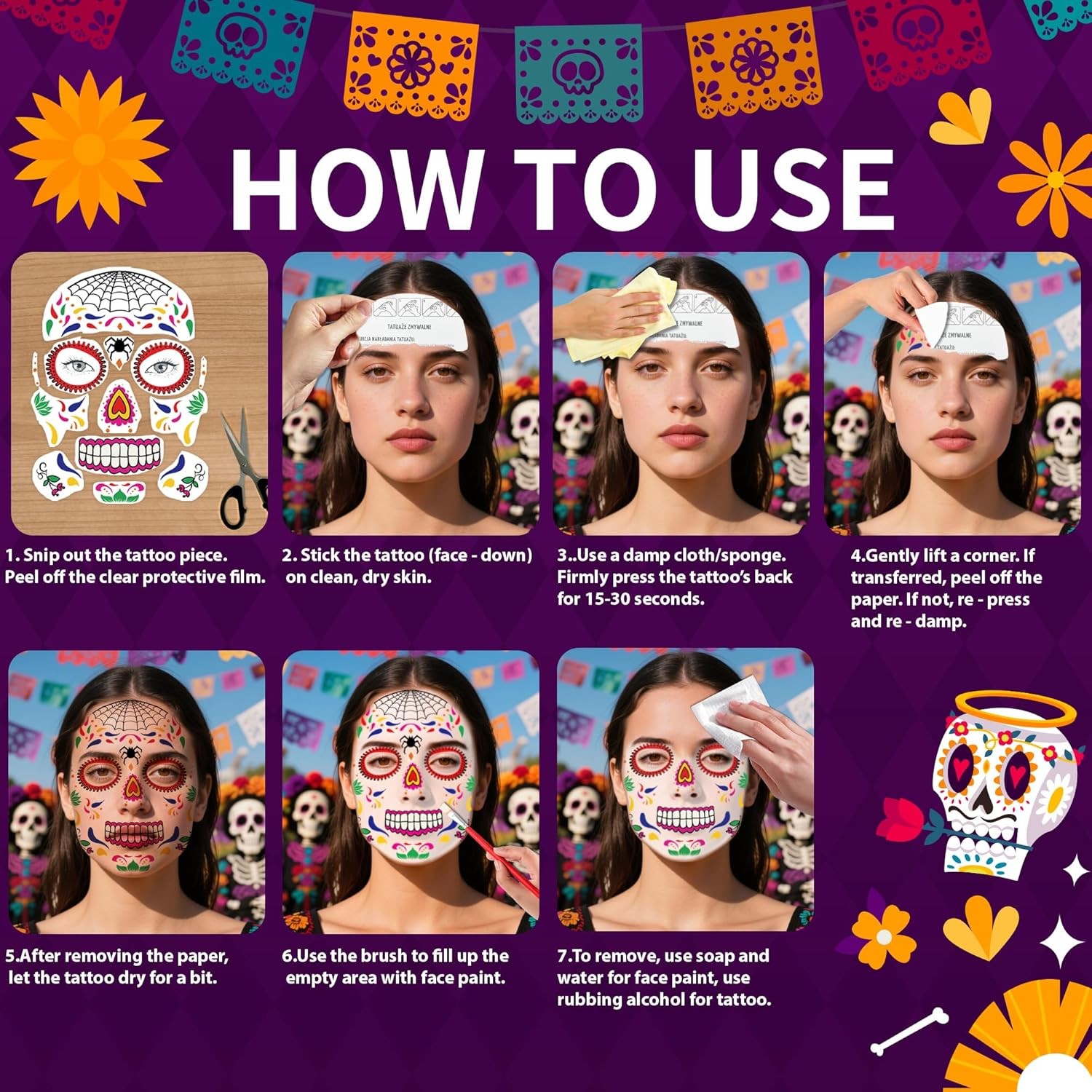18 Pack Day of the Dead Face Tattoos, Sugar Skull Catrina Makeup Kit, Halloween