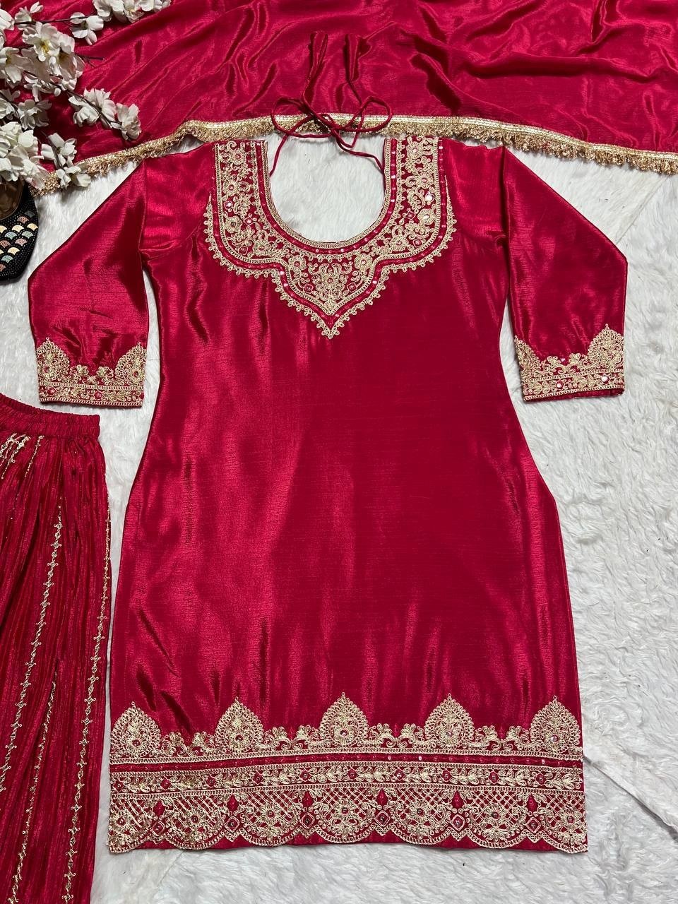 Stunning Look Heavy Chinnon Silk Top Palazzo With Red Dupatta For Ethnic Wear