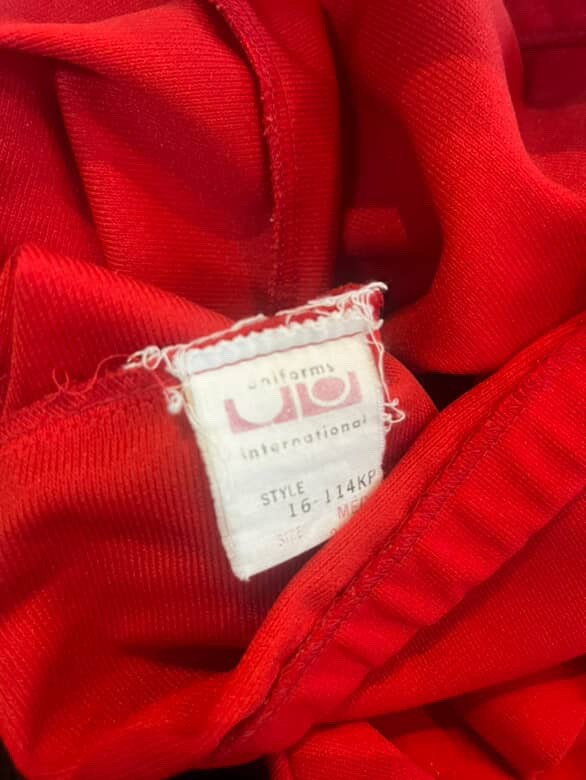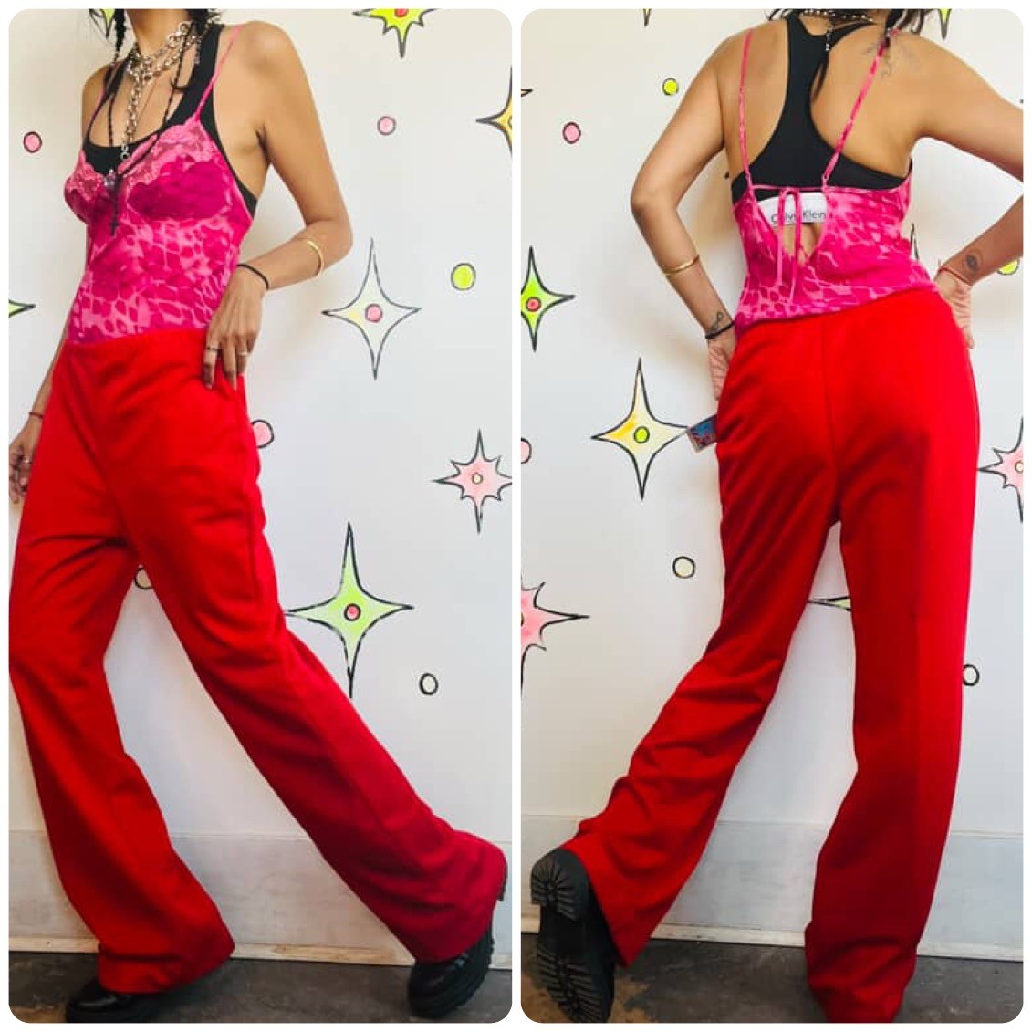 как выглядит Vintage 70s Cherry Red Disco Bellbottom Pants  Groovy Polyester Wide Leg  M фото