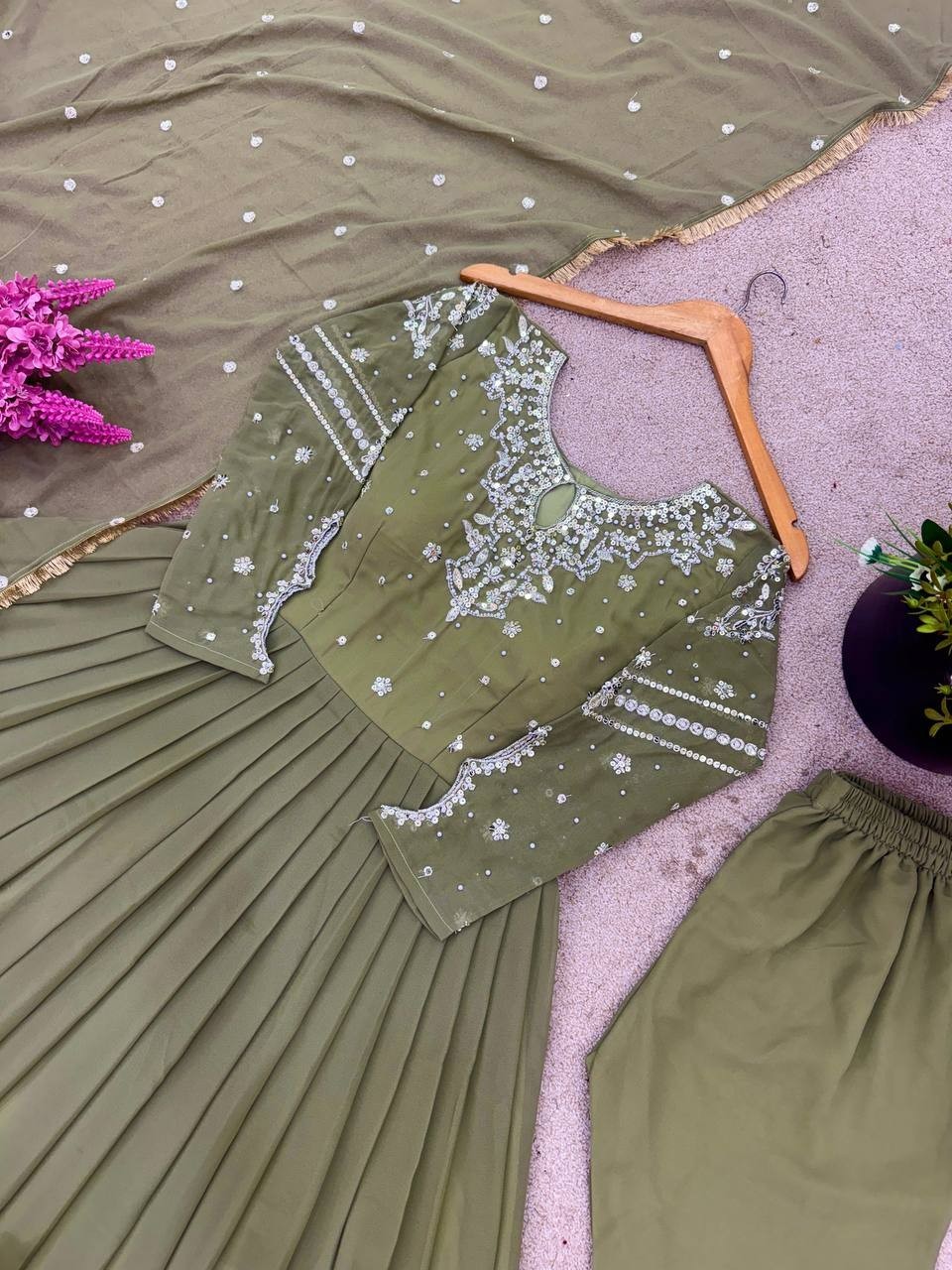 Ethnic Wear Faux Georgette Gown Bottom And Fancy Sage Green Dupatta For Wedding