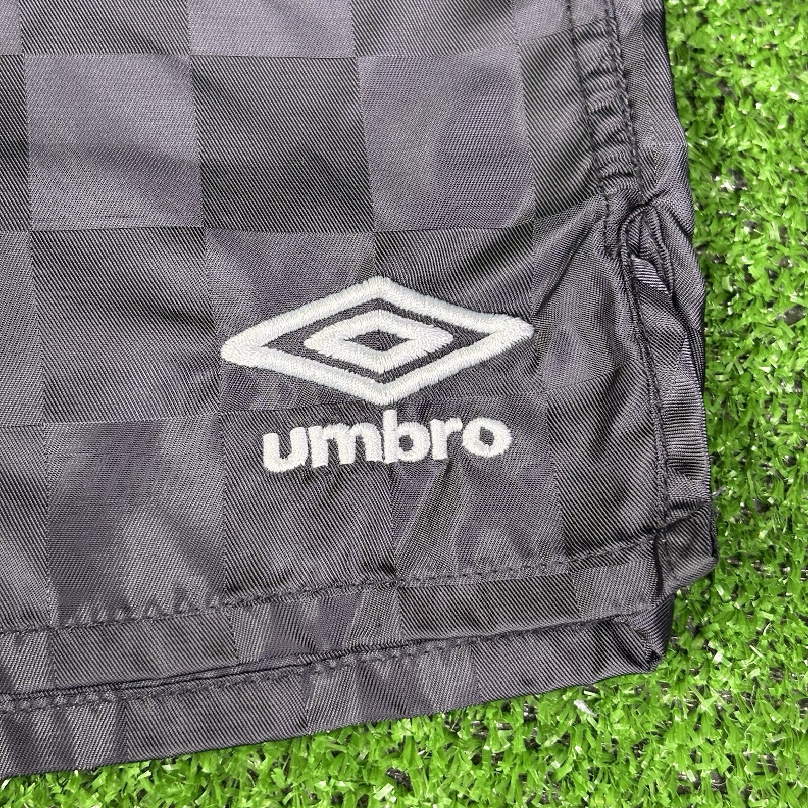 как выглядит Vintage Umbro Black Satin Checkered Soccer Gym Shorts Youth Boys Size Medium фото