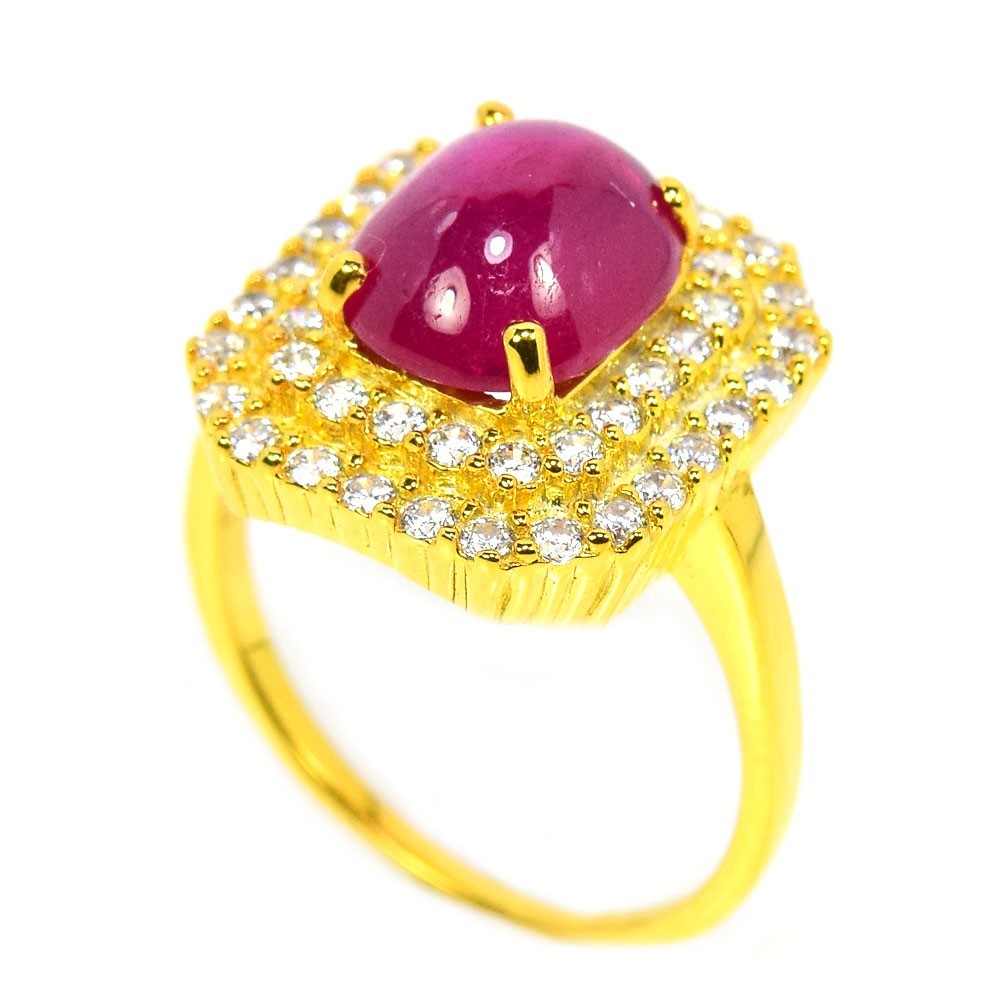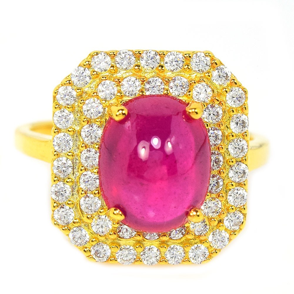 как выглядит 925 STERLING SILVER RING GENUINE PINK RED RUBY OVAL CABOCHON WHITE CZ SIZE 7 фото