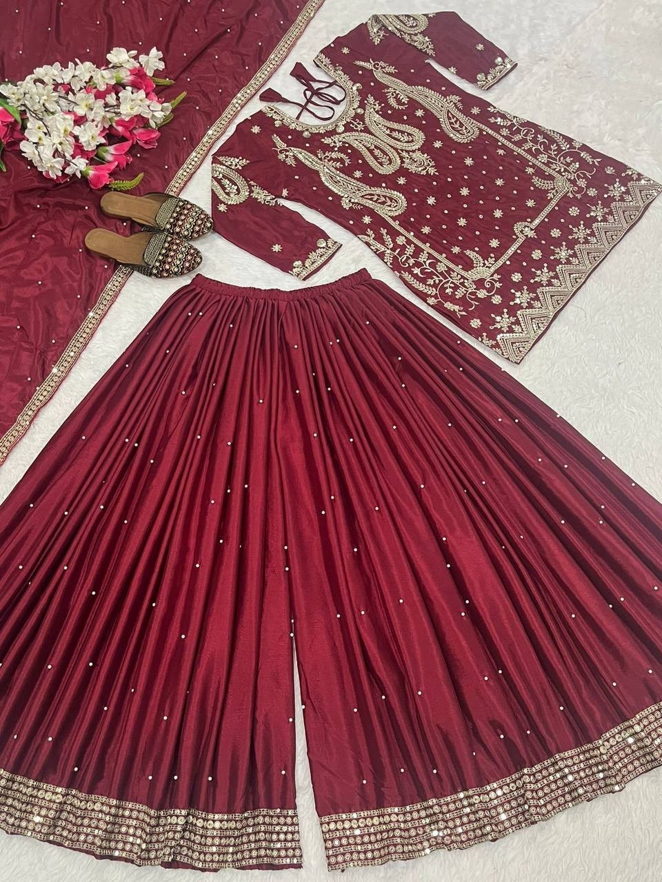 New Fancy Heavy Chinnon Silk Maroon Top Palazzo With Dupatta For Engagement Wear