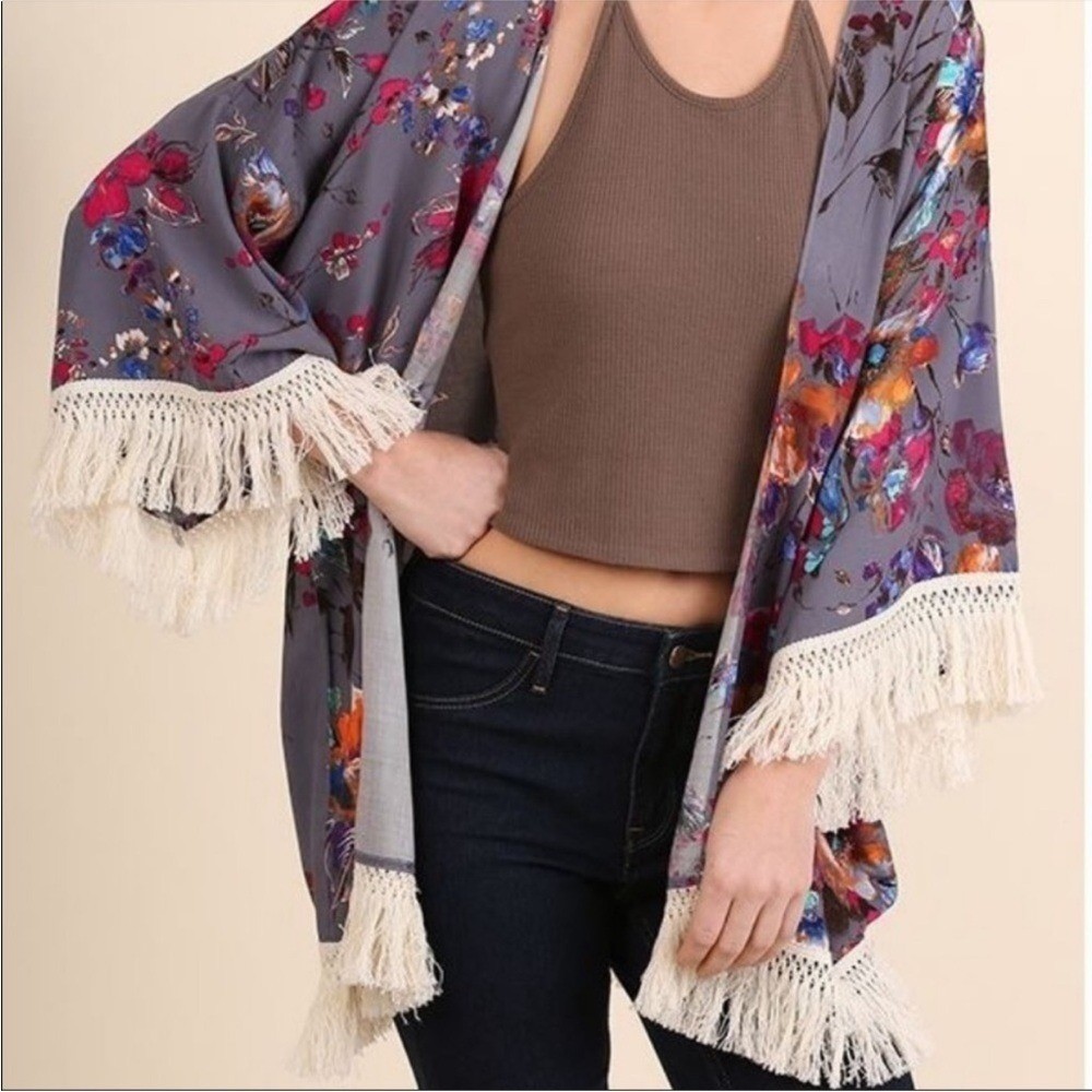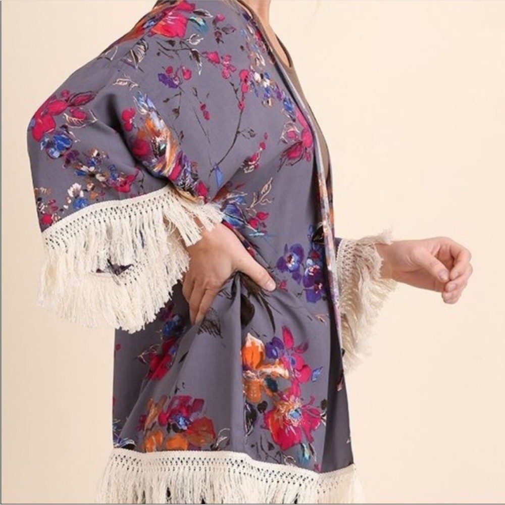Umgee Floral Boho Hippie Fringe Festival Kimono Cardigan size Small