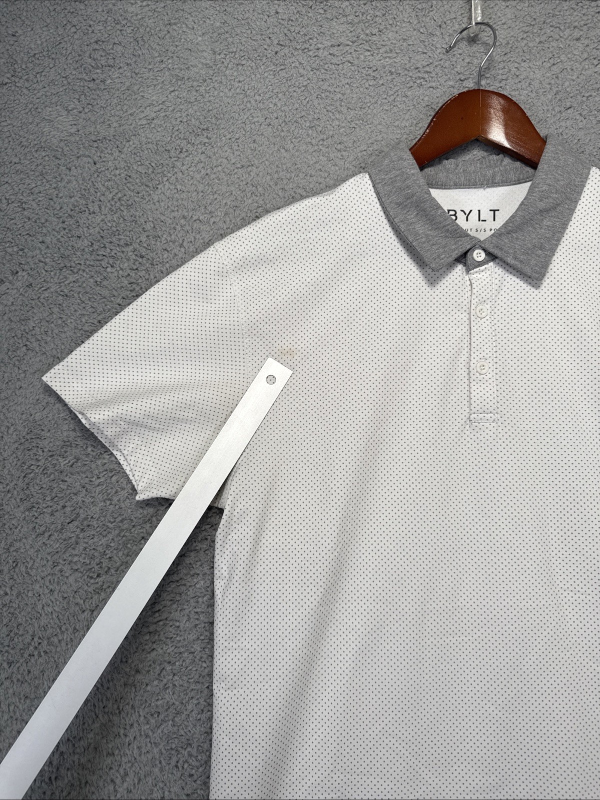 BYLT Men Shirt Large Polo Drop Cut White Gray Dot Lux Knit Preppy S/S READ