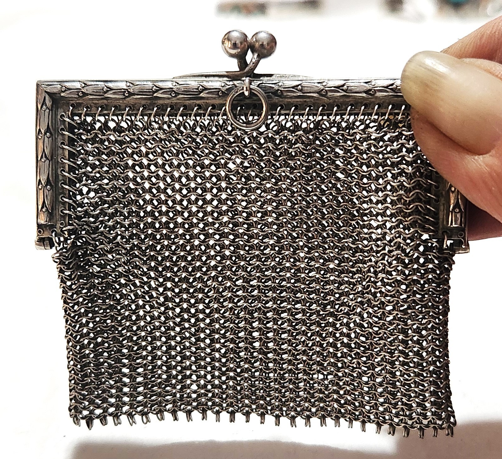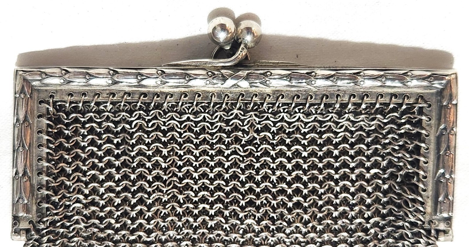 • Antique Sterling Silver Mesh Evening Coin Purse w/Olive Branch Relief Frame 37g