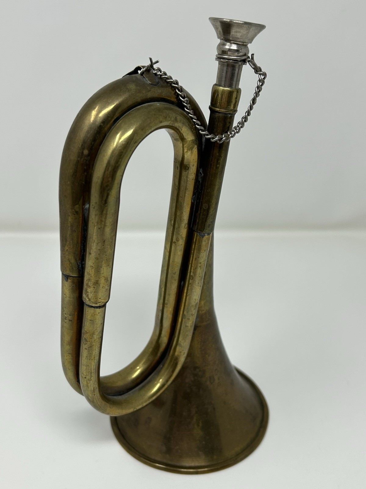 Vintage Brass Bugle w/ Chained Mouthpiece 9 Tall Patina Decor/Prop