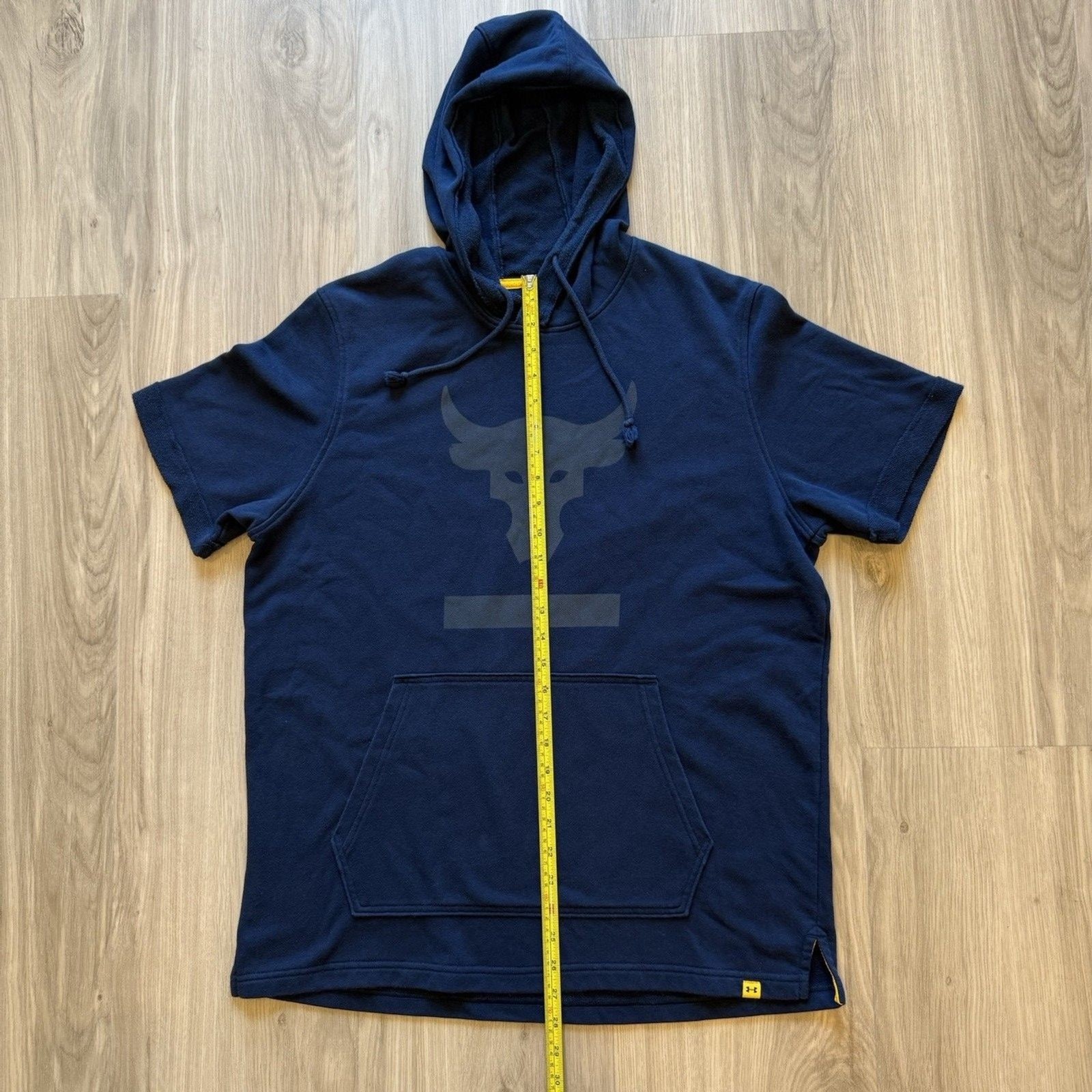 как выглядит Under Armour Project Rock Mens L Short Sleeve Terry Hoodie Brahma Bull Blue EUC фото