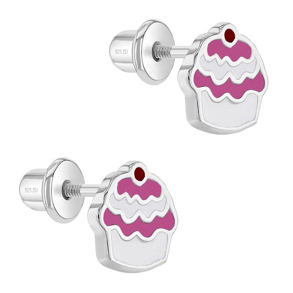 как выглядит Enamel Cupcake Baby / Toddler / Kids Earrings Screw Back - Sterling Silver фото