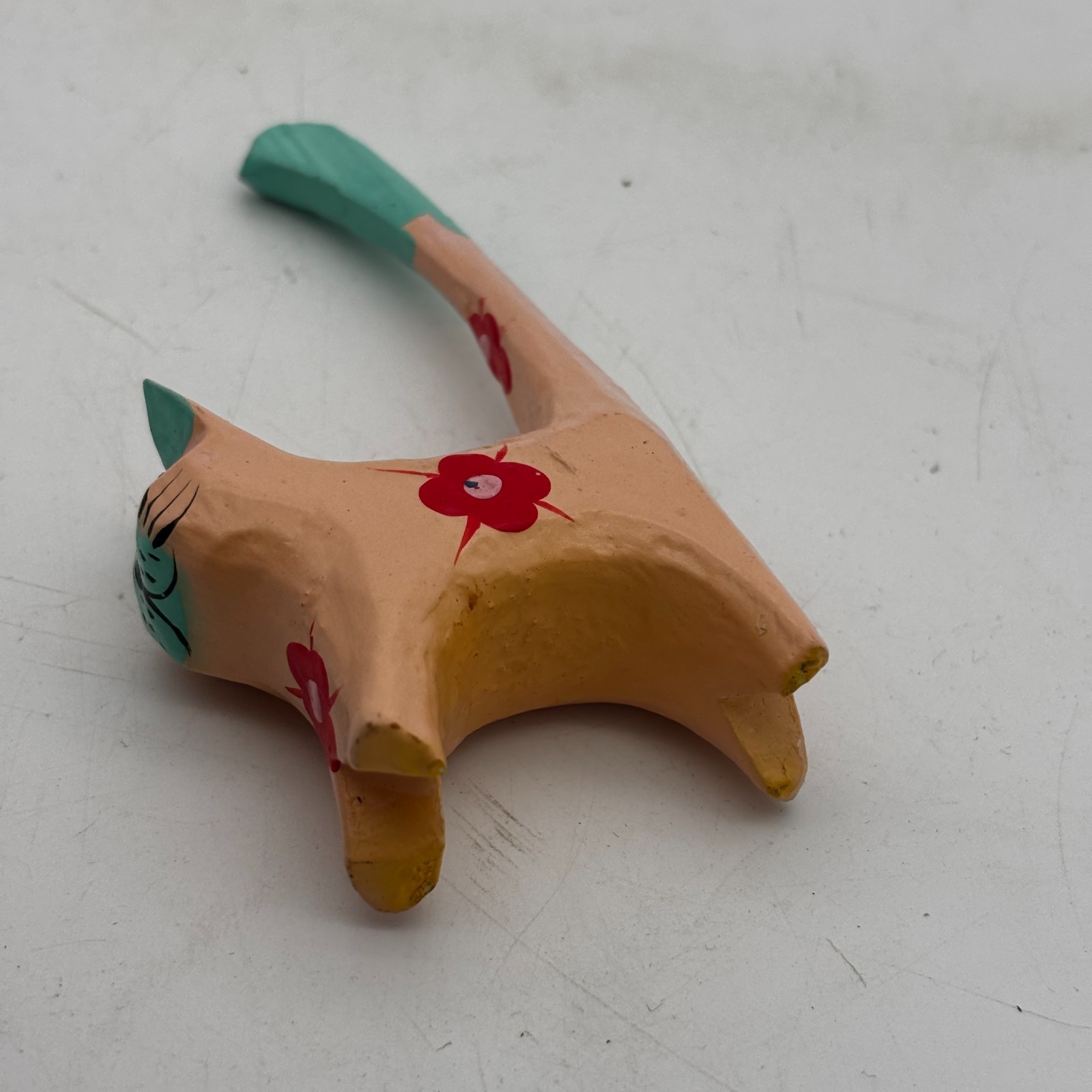 Handpainted Wooden Cat Kitten Figurine Pink Floral Folk Art Style Vintage Look