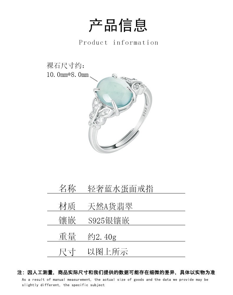 Inlaid natural A-grade jadeite blue water egg shaped jade ring