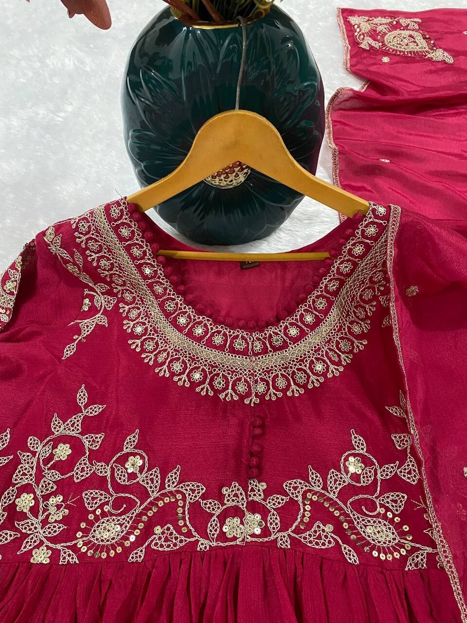 как выглядит Latest Collection Chinnon Silk Rani Pink Salwar Kameez With Dupatta For Festival фото