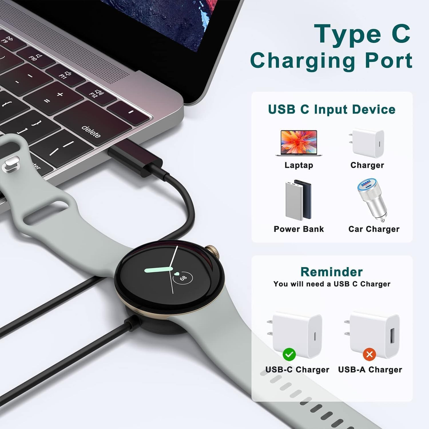 Charger for Google Pixel Watch 3 Fast Charge Cable Replacement Type-C USB Magnet