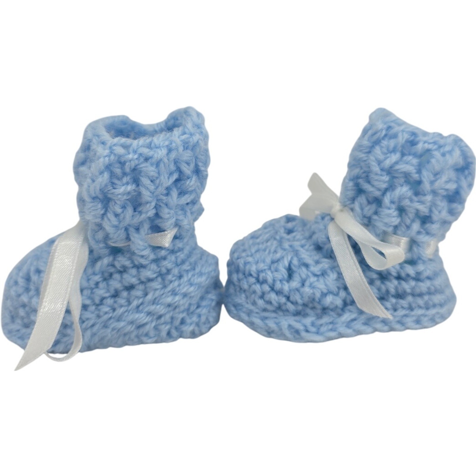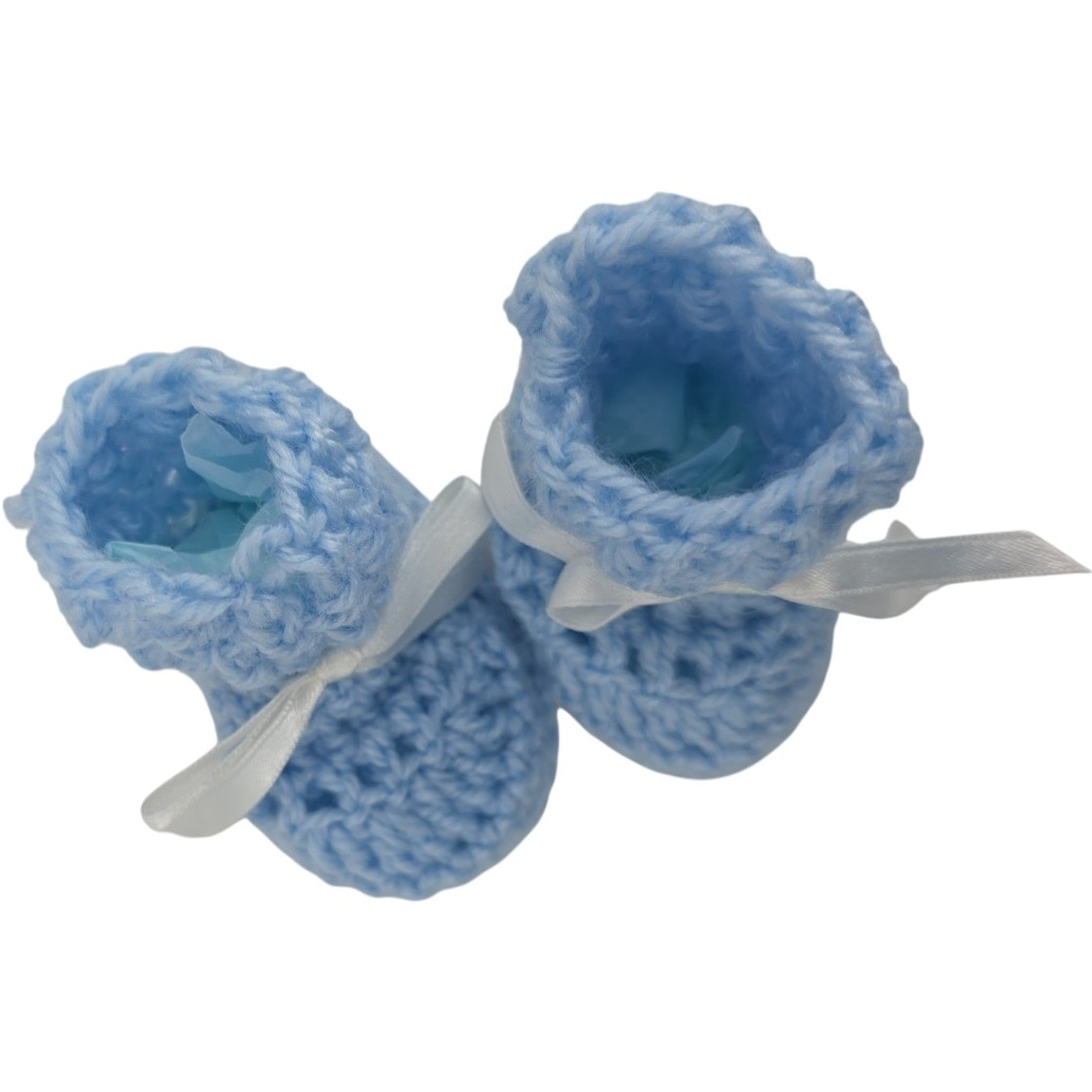 Vintage Handmade Blue Crochet Baby Booties with White Ribbon Ties 3 Foot