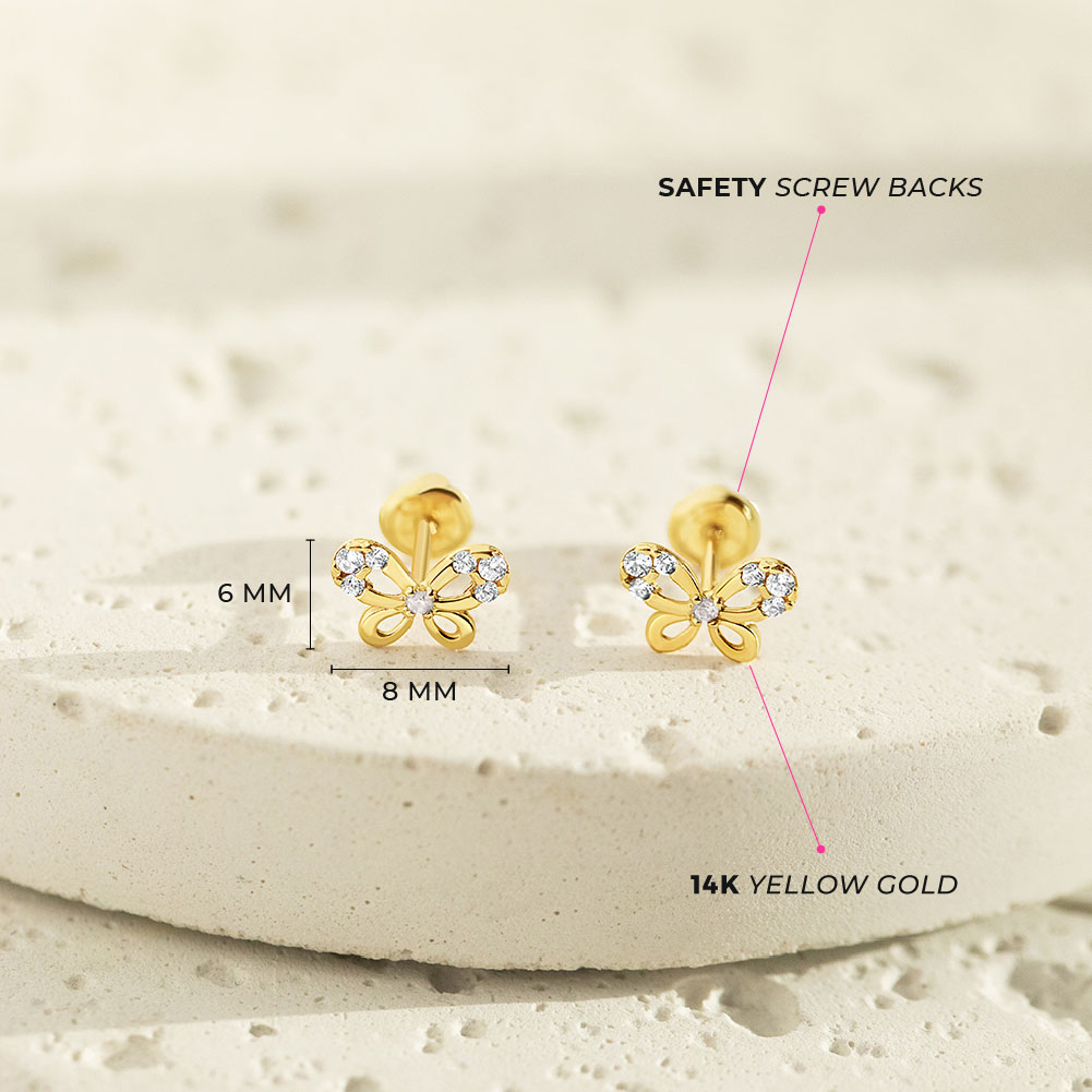 14k Yellow Gold Young Girls Dainty Cubic Zirconia Butterfly Screw Back Earrings