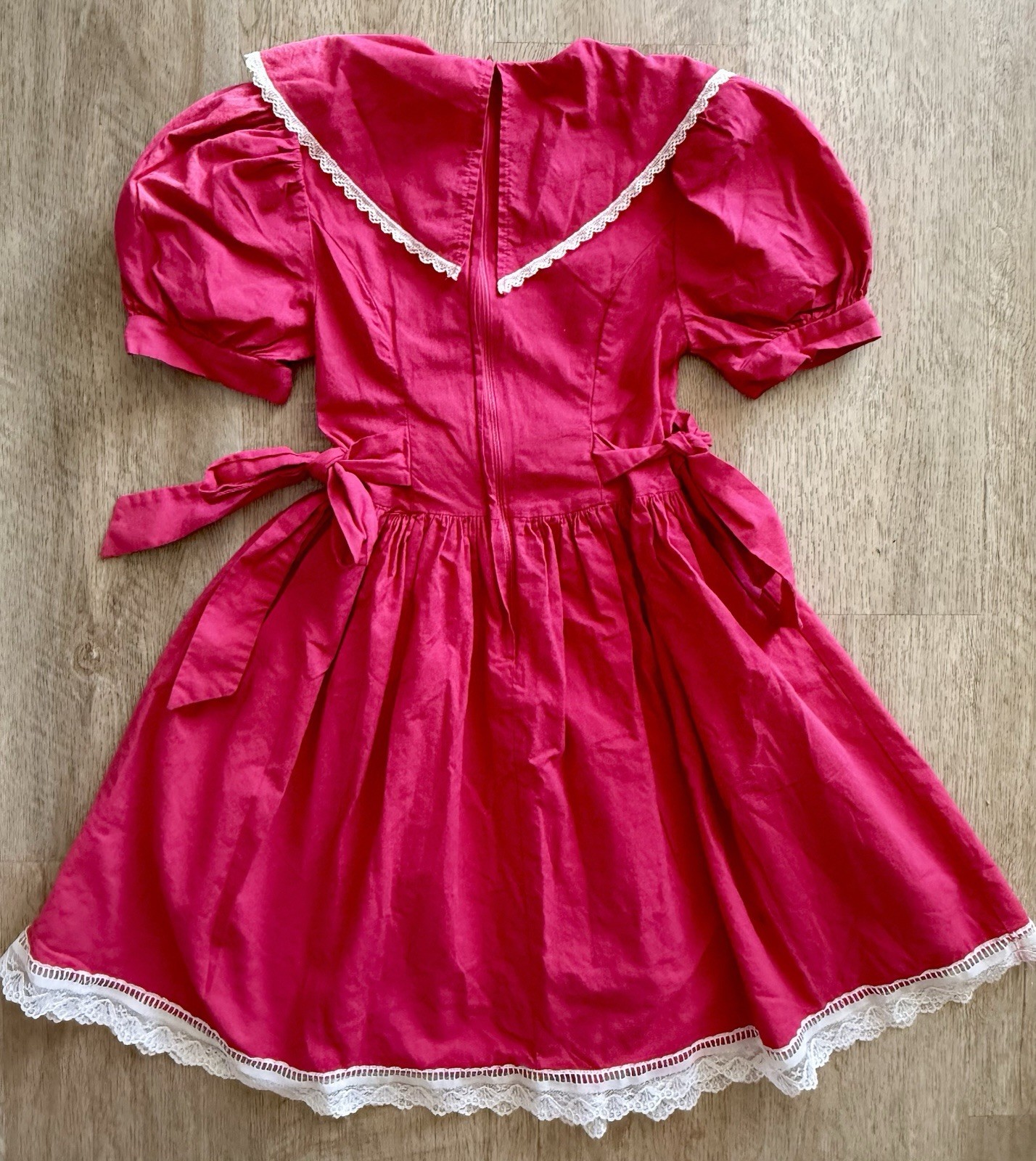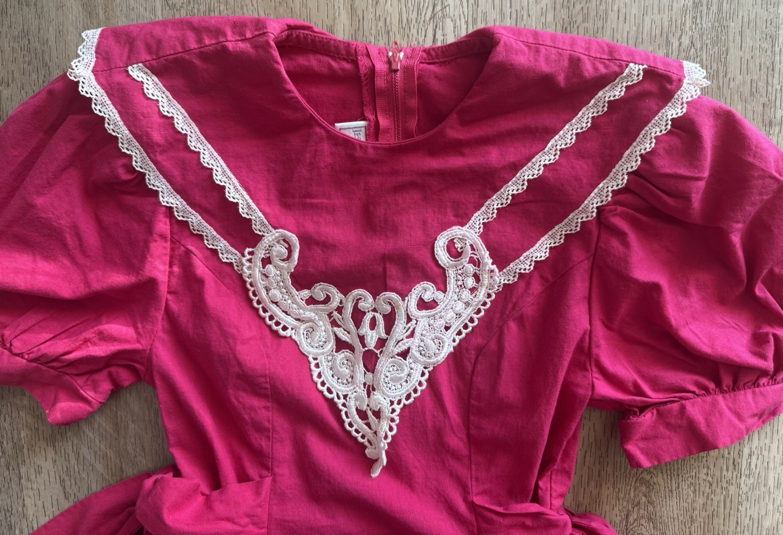 Vintage Gunne Sax Jessica McClintock Magenta Girls Dress Size 7 Lace Trim Ties