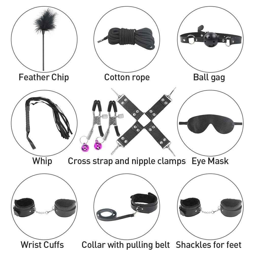 BDSM Bondage Set with Handcuffs, Ankle Cuffs, Whip - Couples 10pcs Adult Kit