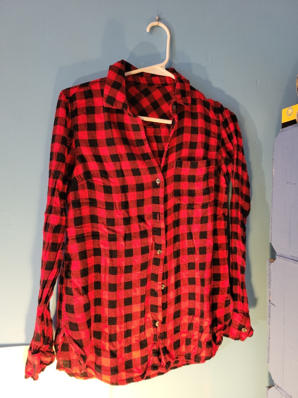 Womens Long Sleeve Button Up Red Plaid Flannel Shirt Size S