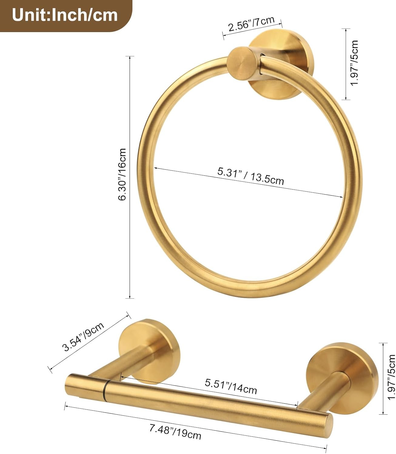 Brushed Gold Bathroom Accessory Set: Toilet Paper Holder Towel Ring
