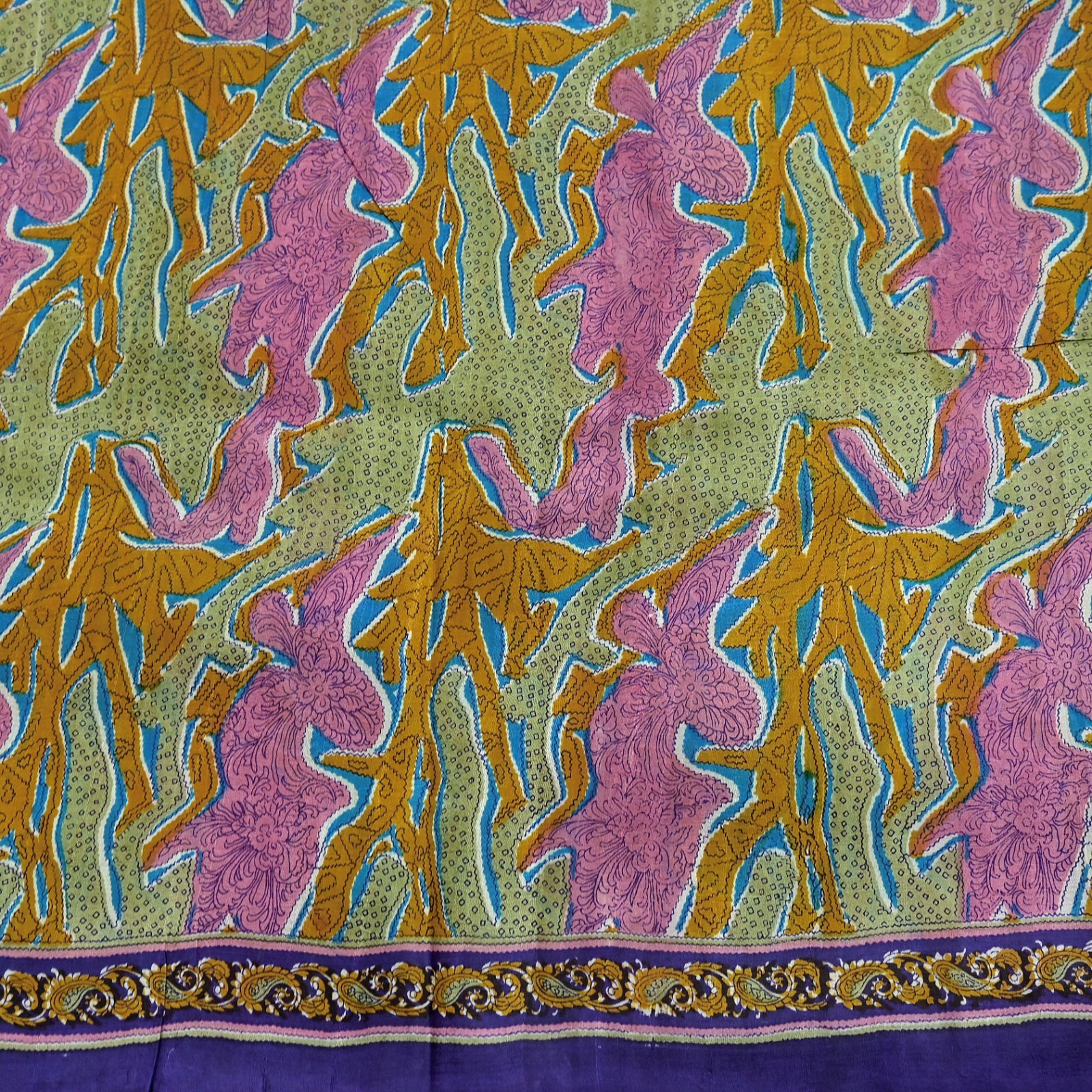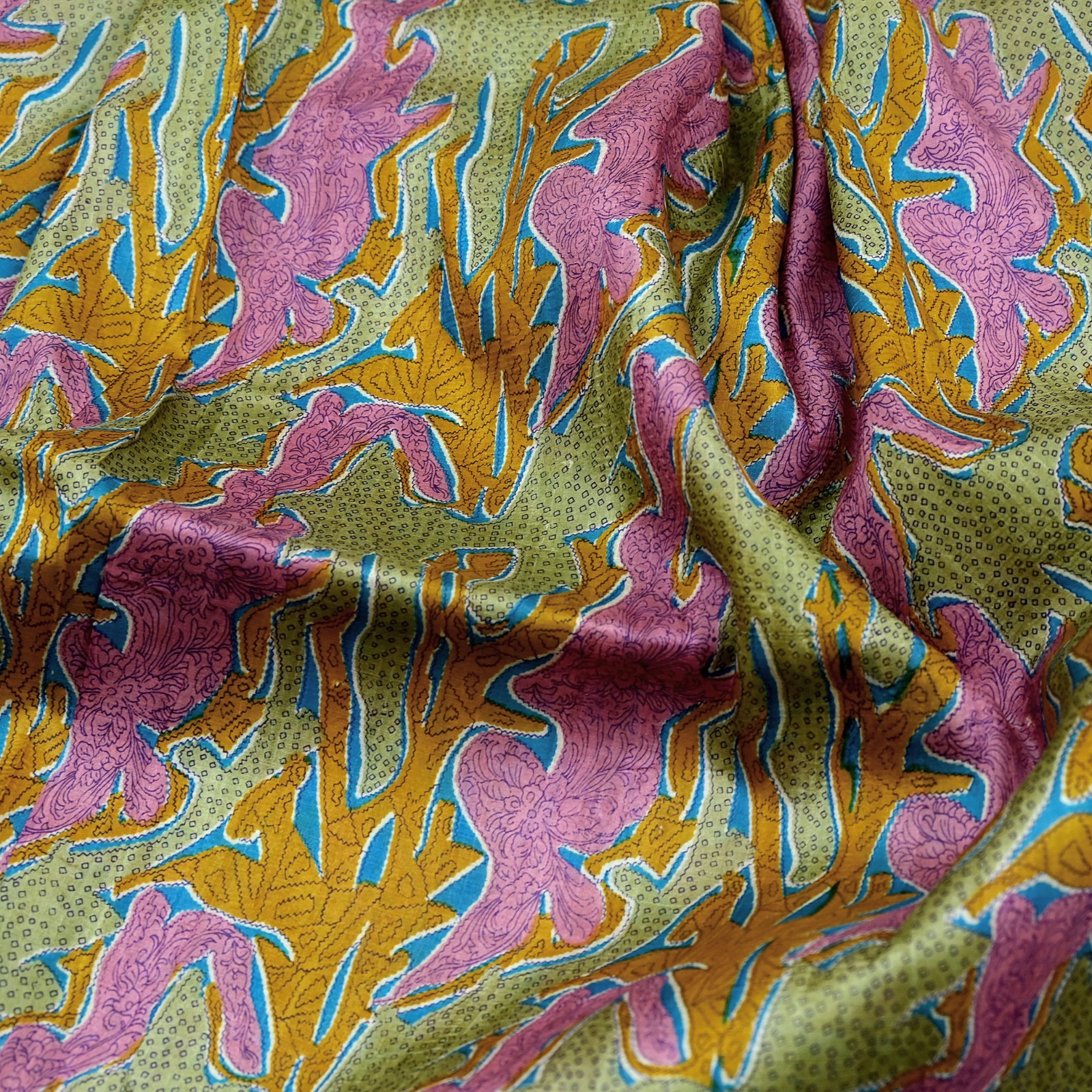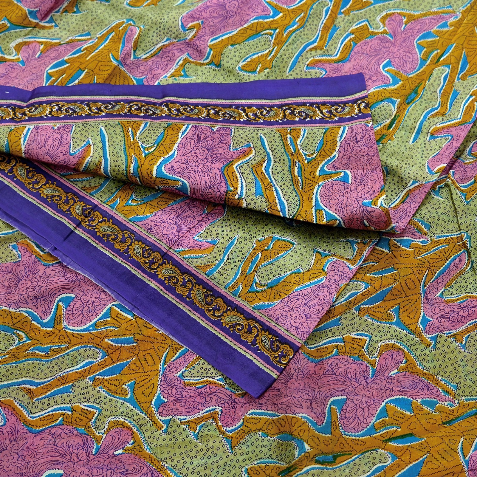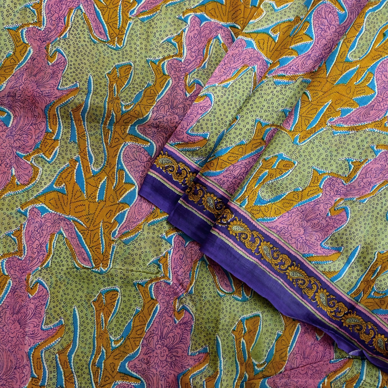 Vintage Sari Pink Green Pure Silk Printed Saree 5yd Sewing Fabric Dressmaking