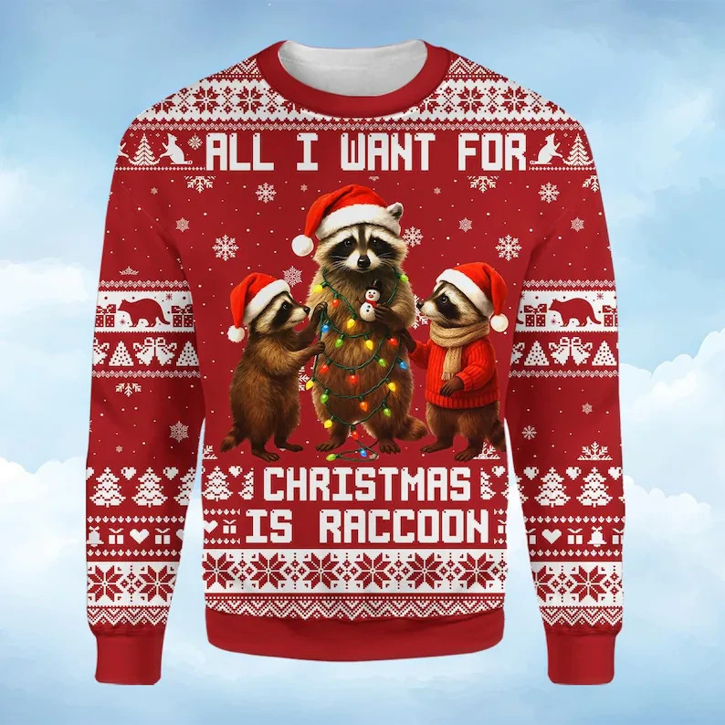 Funny Raccoon Christmas Ugly Sweater All I Want Holiday Pullover Unisex