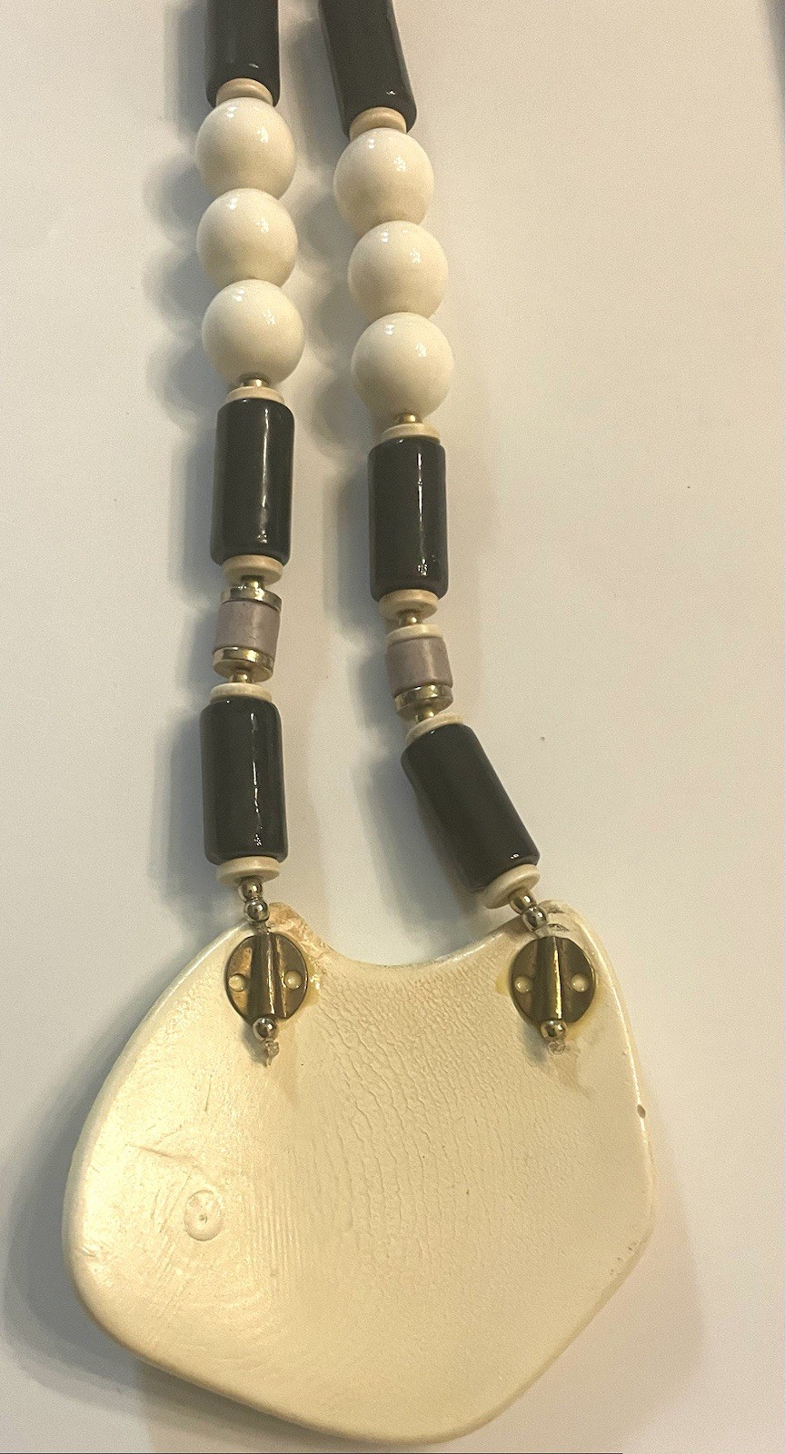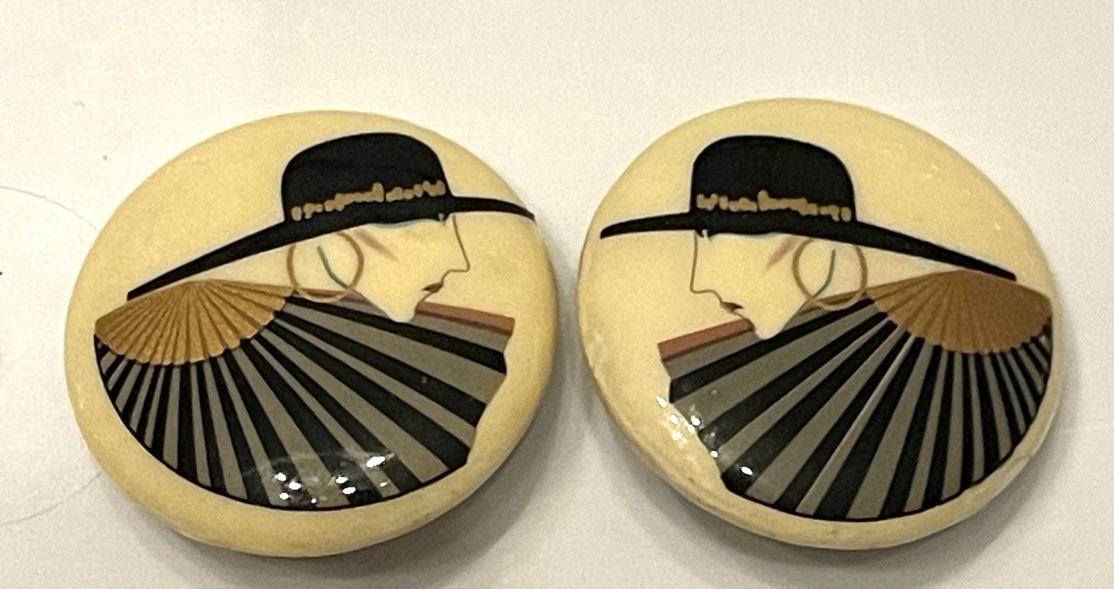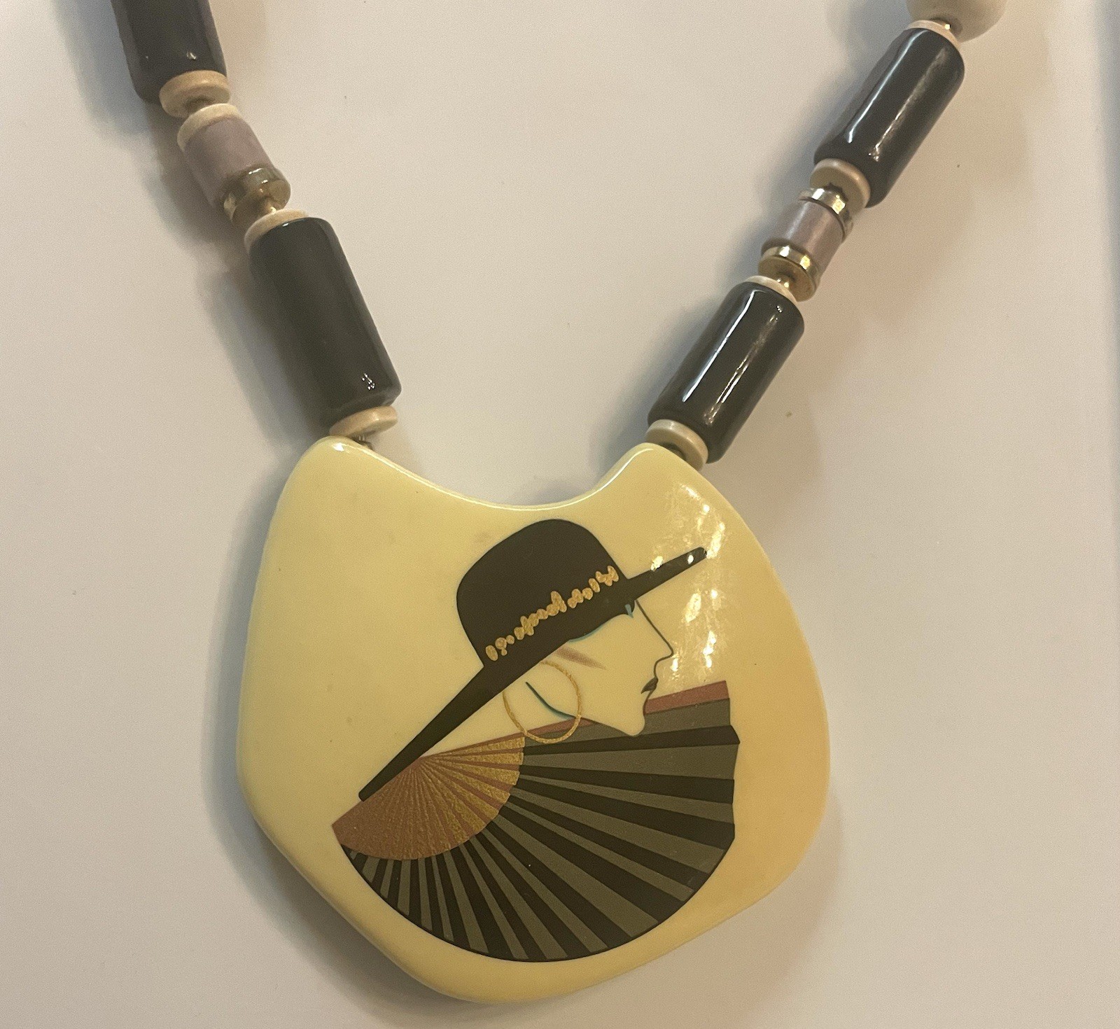 как выглядит Vintage Necklace Earring Set Signed Art Deco Lady With Black Hat Beaded Lucite фото