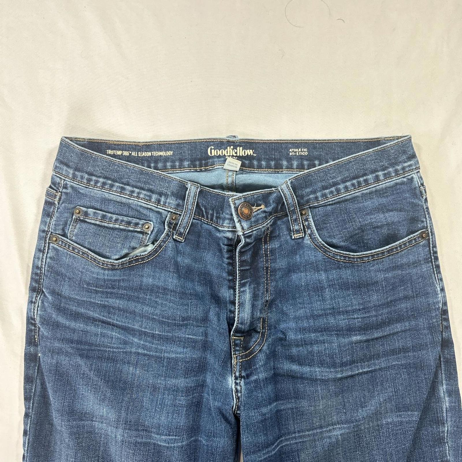 Goodfellow Co. Athletic Fit TruTemp 365 Jeans in classic dark indigo wash.