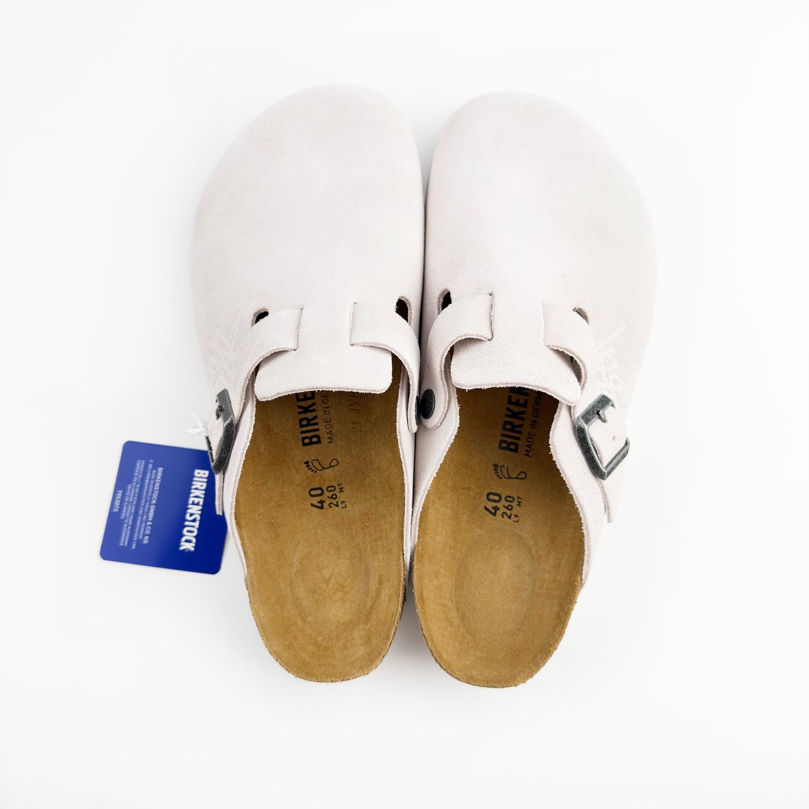 как выглядит Birkenstock Stussy Boston Bone Suede Classic Clogs Women s Shoes фото
