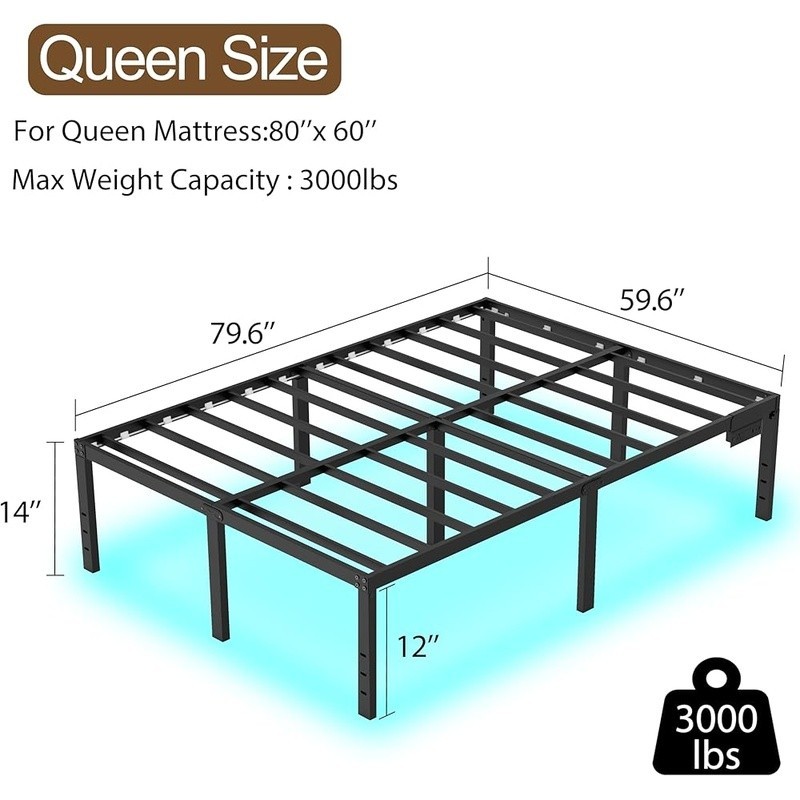 Queen Bed Frame W/ LED Lights Charging Station Heavy Duty Platform Bed Frame New