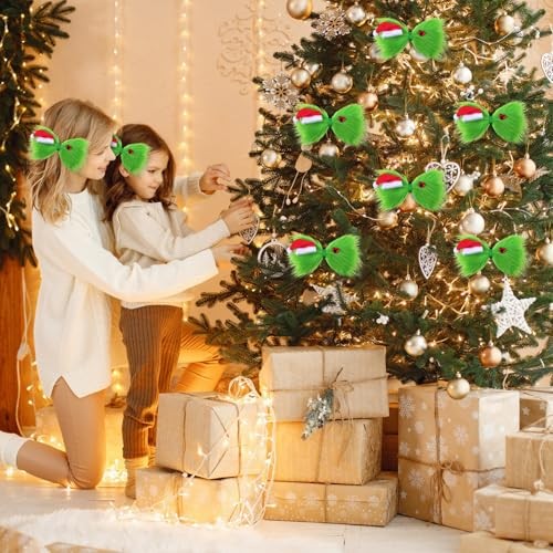 как выглядит Large 9" Red Green Furry Hair Bow Clip with Mini Santa Hat and Red Xmas Hat фото